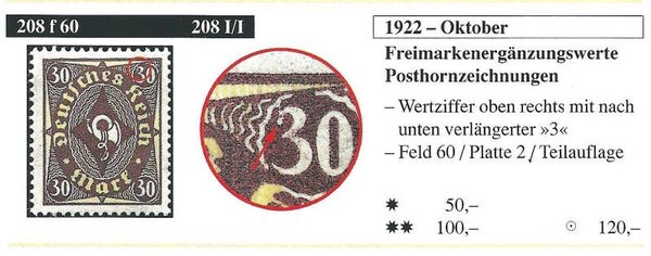 MiNr. 208 postfrisch, Plattenfehler I (f60): oberer Bogen der 3 der rechten oberen Wertangabe nach unten verlängert - Feld 60 Teilauflage Michelwert: 90,00 €