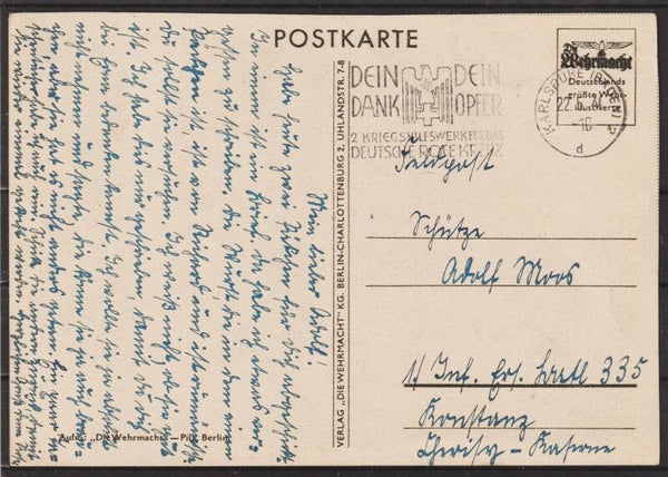 Stempel: "Die Wehrmacht, Deutschlands größte Wehrillustrierte" "Dein Dank Dein Opfer 2. Kriegshilfswerk für das Deutsche Rote Kreuz"