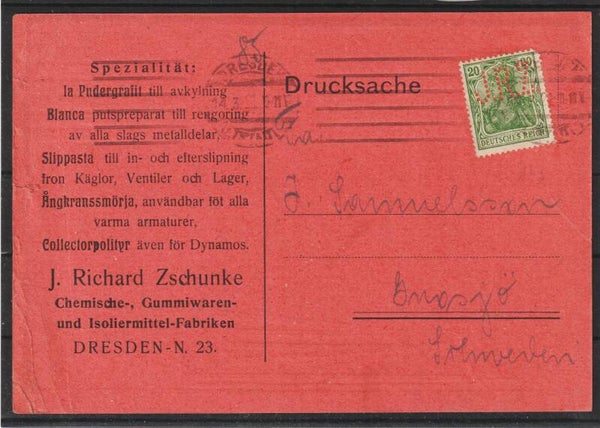 MiNr. 143 b Einzelfrankatur auf Postkarte mit Zudruck der Firma J. Richard Zschunke aus Dresden vom 14.3.21 nach Schweden