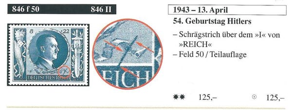 MiNr. 846 postfrisch, Plattenfehler II (f50): Strich über REICH