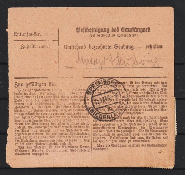 MiNr. 791 Mehrfachfrankatur auf Paketkarte von BRESLAU nach SPREMBERG Katalogpreis: 80,00 €