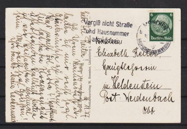 MiNr. 516 Einzelfrankatur auf Postkarte vom 11.11.37 aus MÜNCHEN HAUPTSTADT DER BEWEGUNG und begesetzten Werbestempel: “Vergiß nicht Straße und Hausnummer anzugeben”
