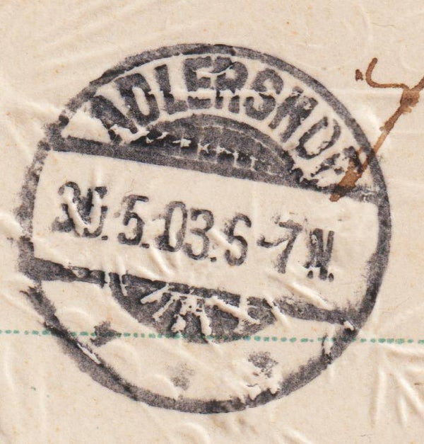 MiNr. 85 Einzelfrankatur auf schöner Prägedruck-Karte, Stempel: ADLERSHOF und BERLIN NW 30.5.03