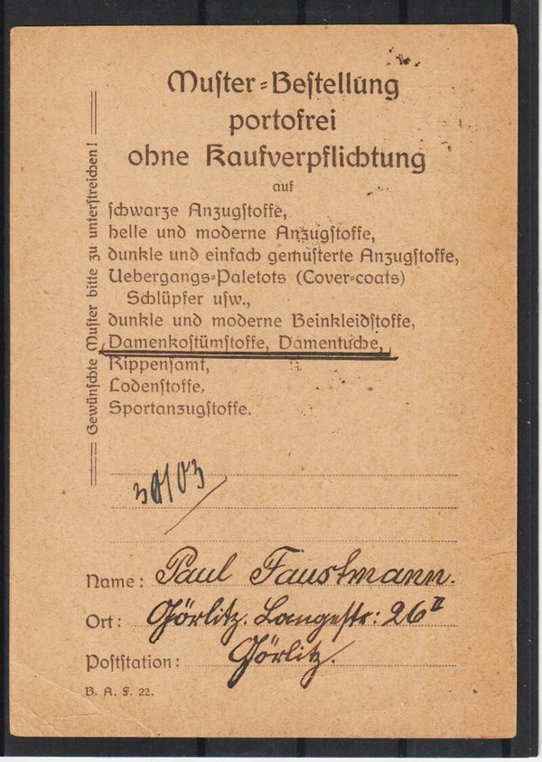 MiNr. 146 auf portogerechter Drucksache mit Zudruck "Musterbestellung ..." von GÖRLITZ nach SOMMERFELD am 8.7.22