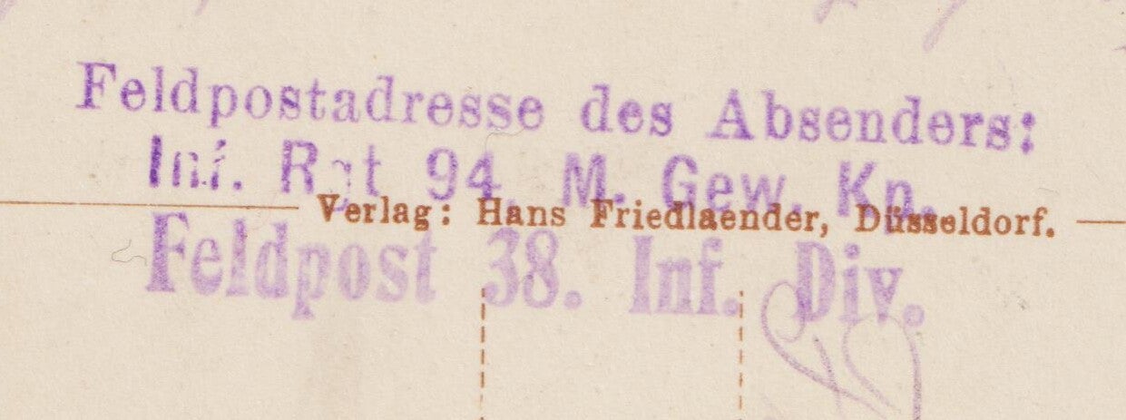 Feldpost Karte aus Lassigny, Stempel : “K.D. Feldpostexped. 38. Infantrie Division" und “Infantrie Regiment 94 Maschinenegeweht Kompanie, Feldpost 38 Infantrie Division”