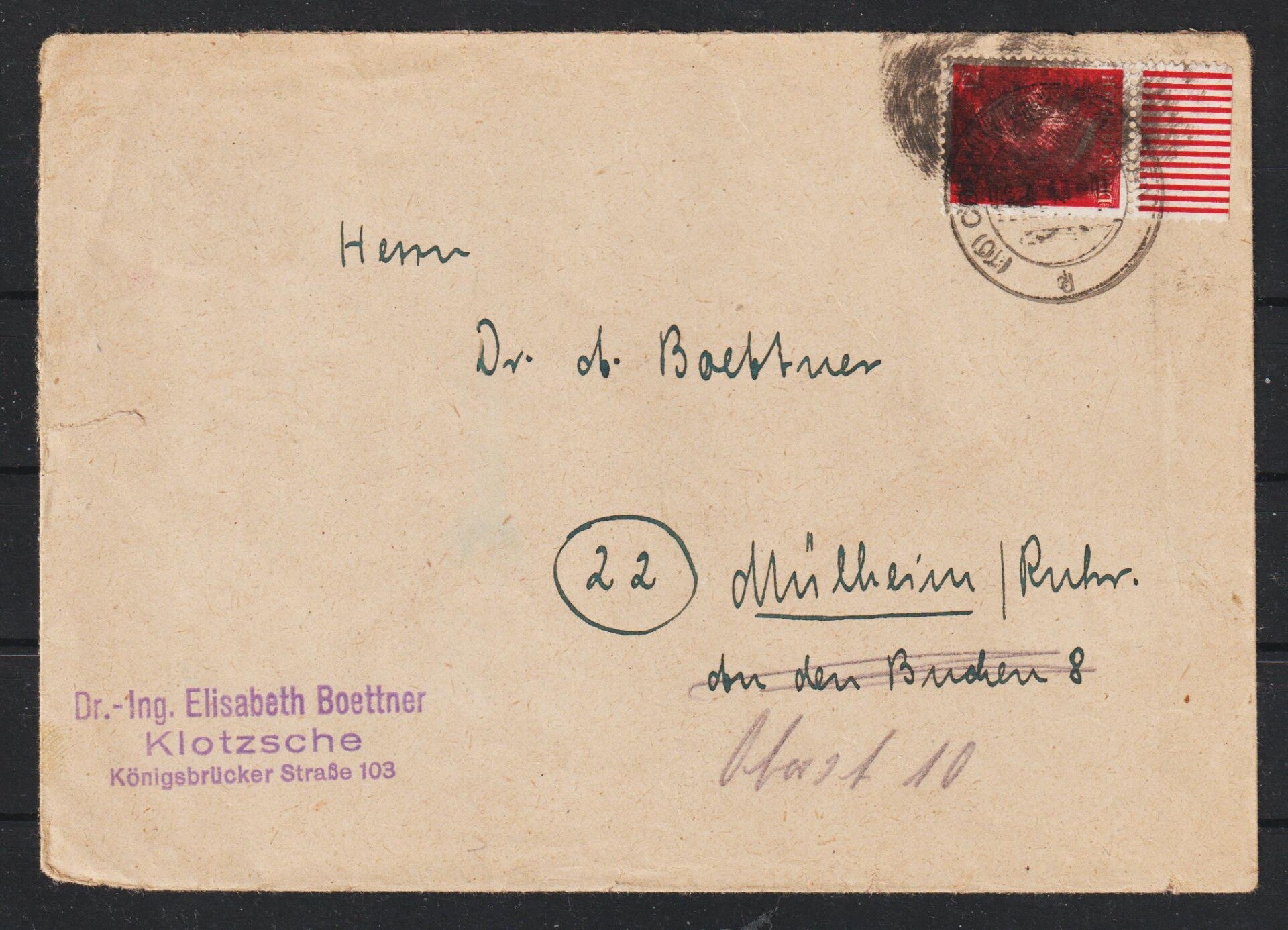MiNr. 827 Einzelfrankatur portogerechter Brief vom 4.7.45 aus Coswig (Bz. Dresden) nach Mühlheim an der Ruhr, sächsische Schwärzung
