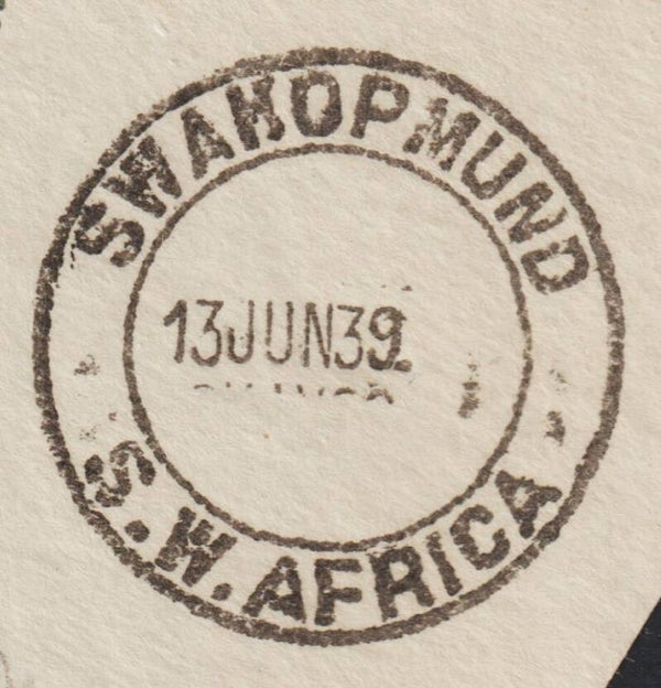 MiNr. 520 Einzelfrankatur auf Postkarte von Hamburg am 20.V.39 nach Südafrika, Ankunftsstemepl: SWAKOPMUND 13.JUN.39