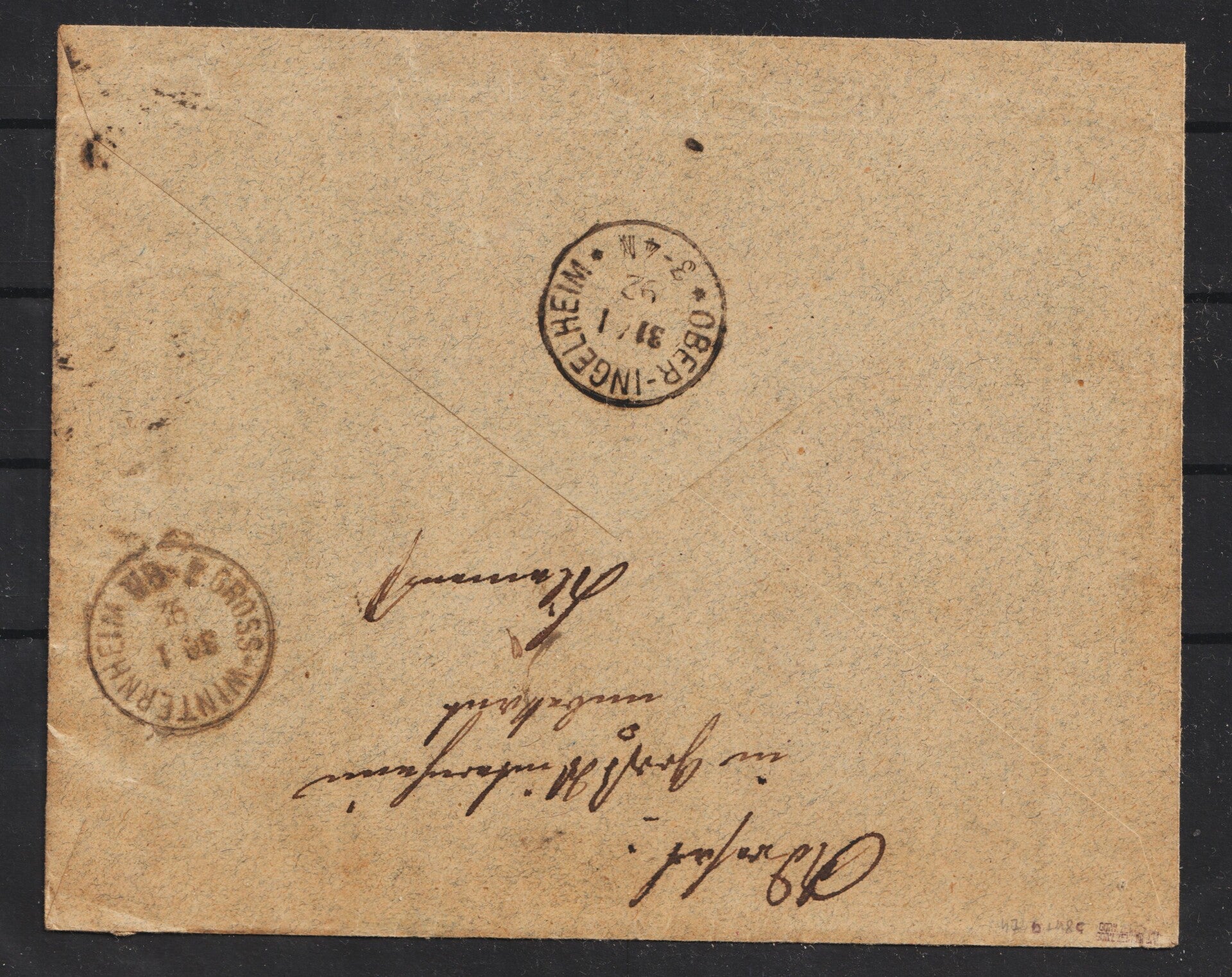 MiNr. 48 c + 47 b auf R-Brief von Ober-Ingelheim nach Gross-Winterheim am 30.1.92, geprüft Zenker BPP, Katalogpreis: 250,00 €