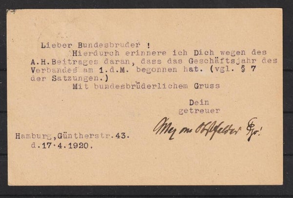 Ganzsache P 110 mit Zusatzfrankatur MiNr. 99 perfins Firmenlochung Th.R. (selten) 17.4.20, portogerecht im Fernverkehr