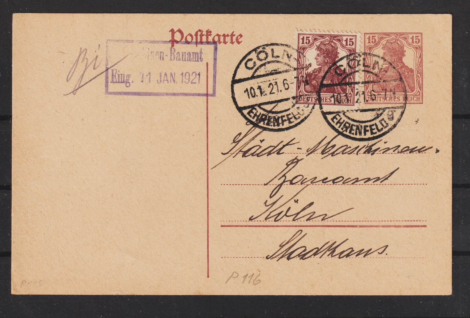Ganzsache P 116 mit Zusatzfrankatur, portogerecht mit 30 Pfennig im Ortsverkehr von CÖLN 10.1.21