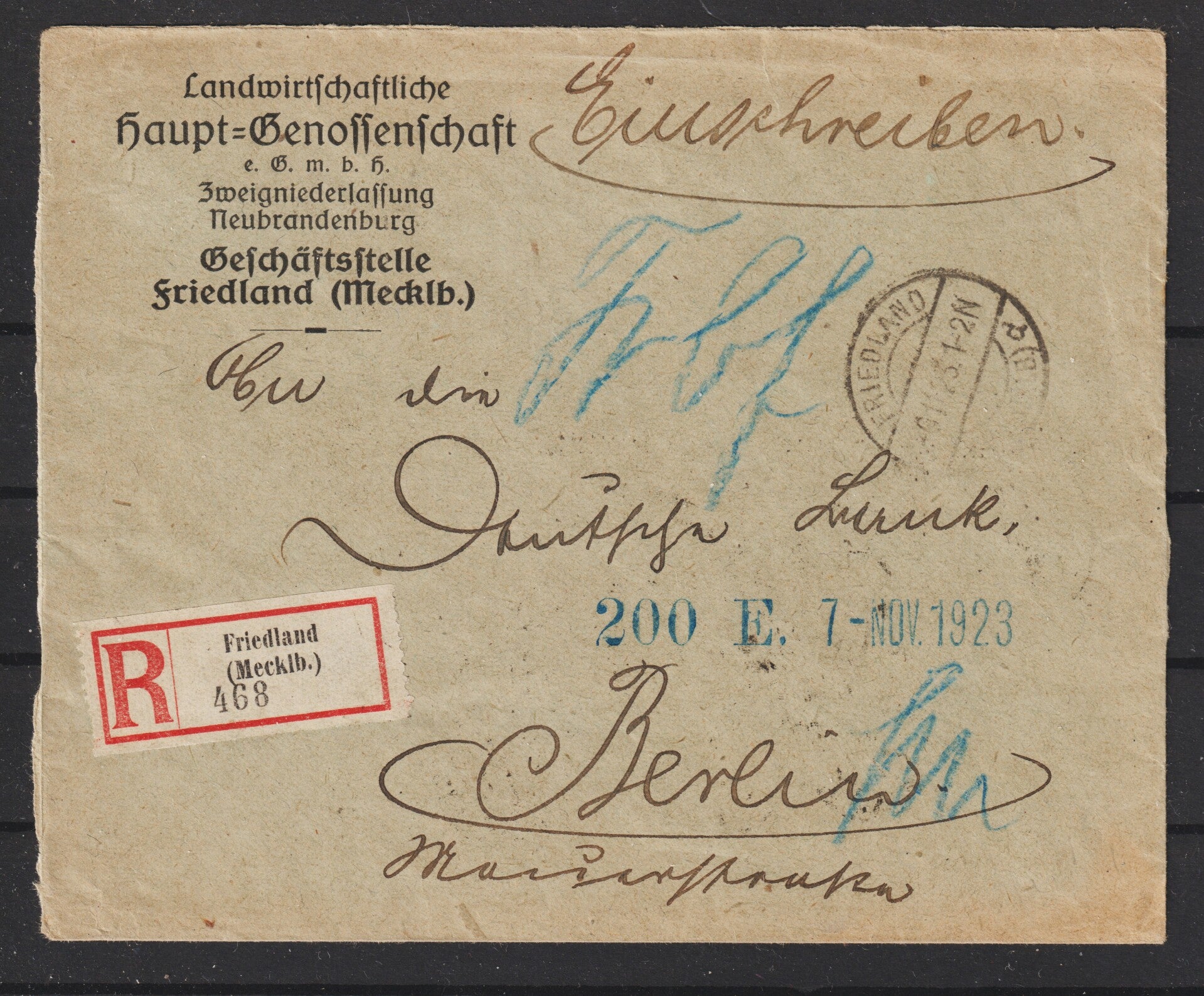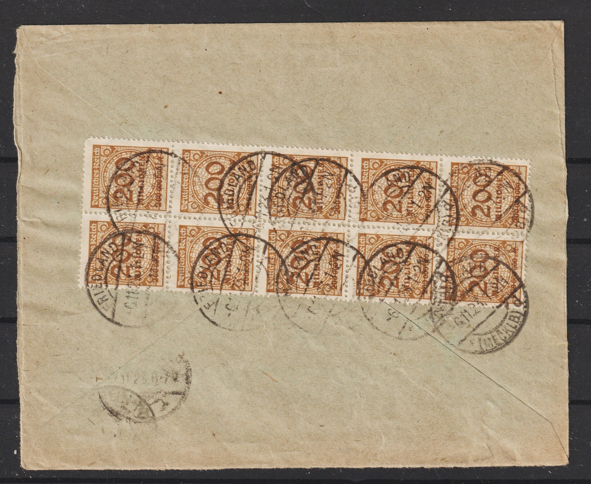 MiNr. 323 im Zehnerblock auf portogerechten R-Brief vom 6.11.23, Portoperiode 23 (1Milliarde Porto + 1Milliarde Eilboten Zuschlag) nur 6 Tage möglich