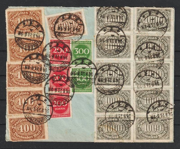 MiNr. 250 (15x), 252 (12x), 254, 269 (3x) 270 (2x) auf Infla Brief vom 24.8.23, Ersttag Portoperiode 16, von Lüdenscheid nach Berlin