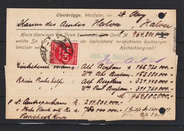 MiNr. 268 (10x), 252 (6x) portogerechte Postkarte im Ortsverkehr am 24.8.23, Ersttag Portoperiode 16, seltene Frankatur