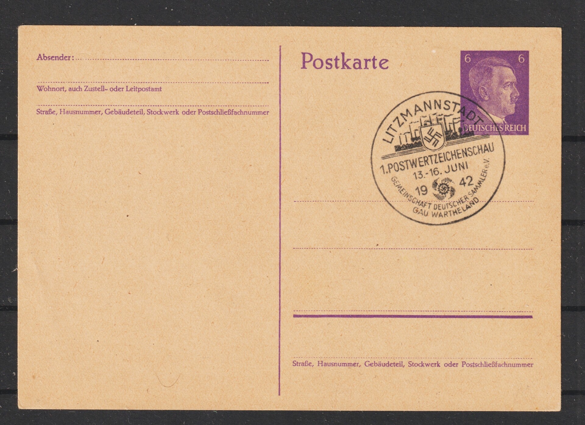 GAU WARTHELAND KAMERADSCHAFT - 1. Briefmarkenschau 1-16. Juni 1942 LITZMANNSTADT mit dazugehörigen Sonderstempel