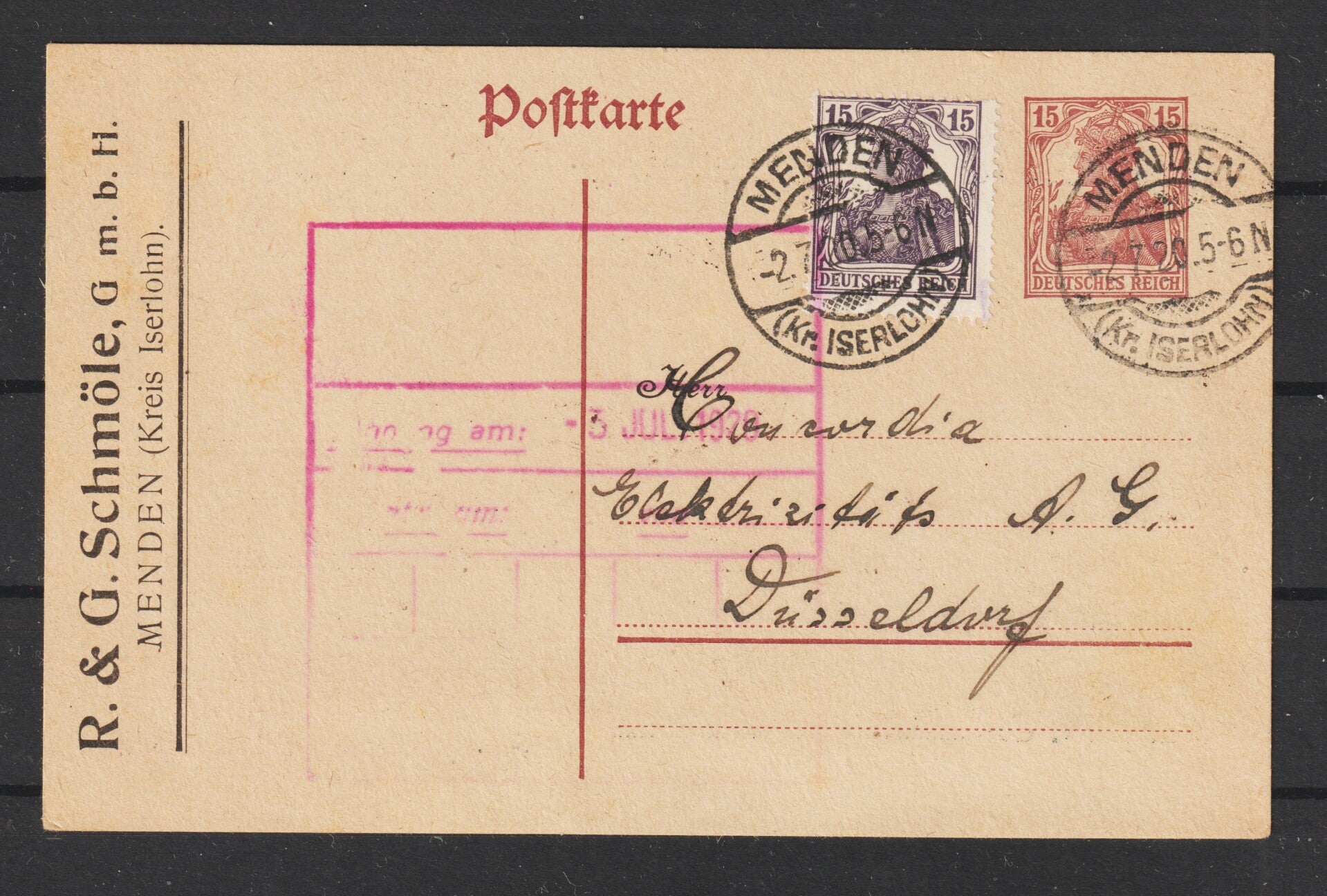 Ganzsache P 116 mit ZuF, MENDEN 2.7.20, Zudruck R.&G. Schmöle (b116)