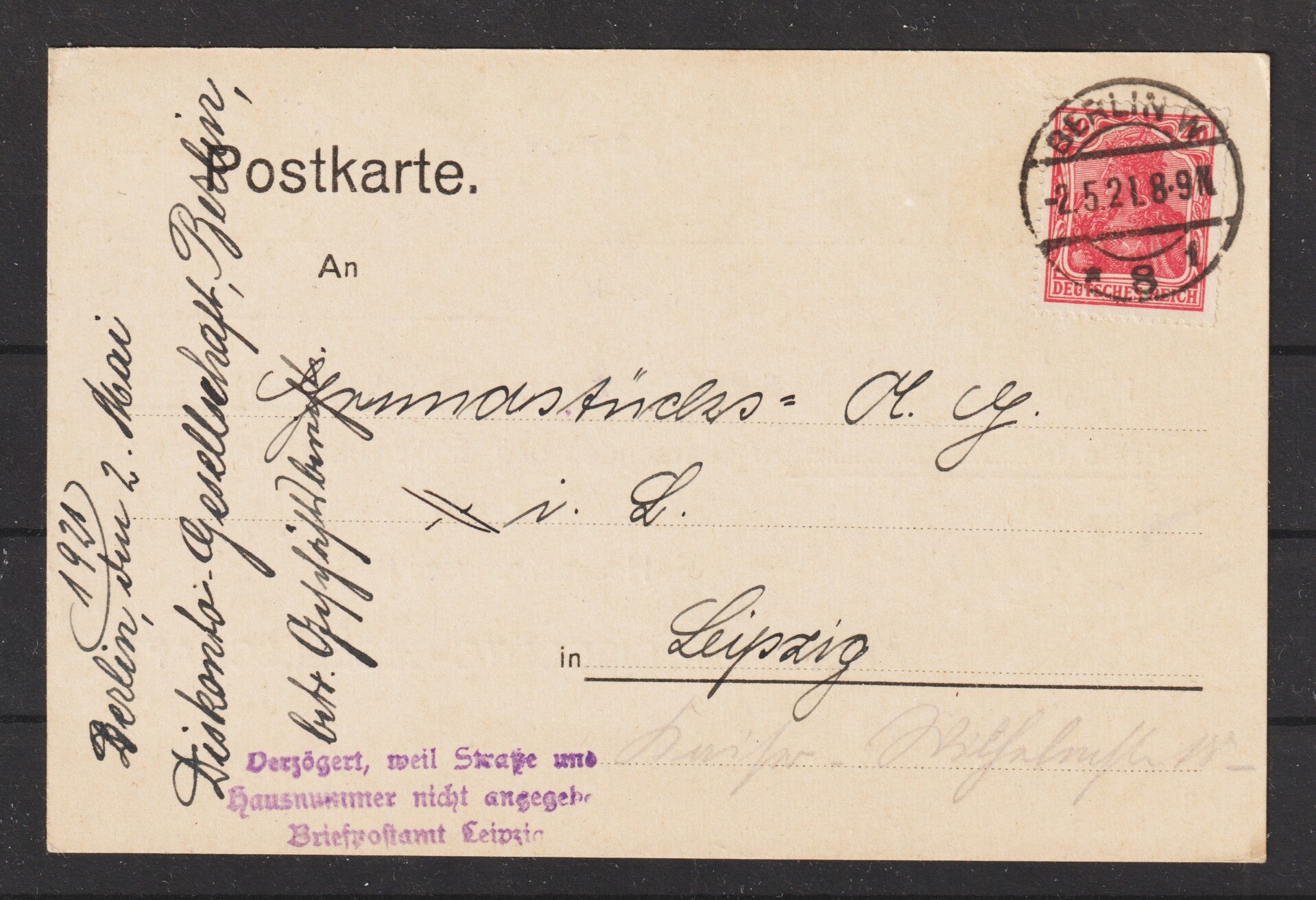 Zustellung "Verzögert, weil Strasse und Hausnummer nicht angegeben, Bezirkspostamt Leipzig"