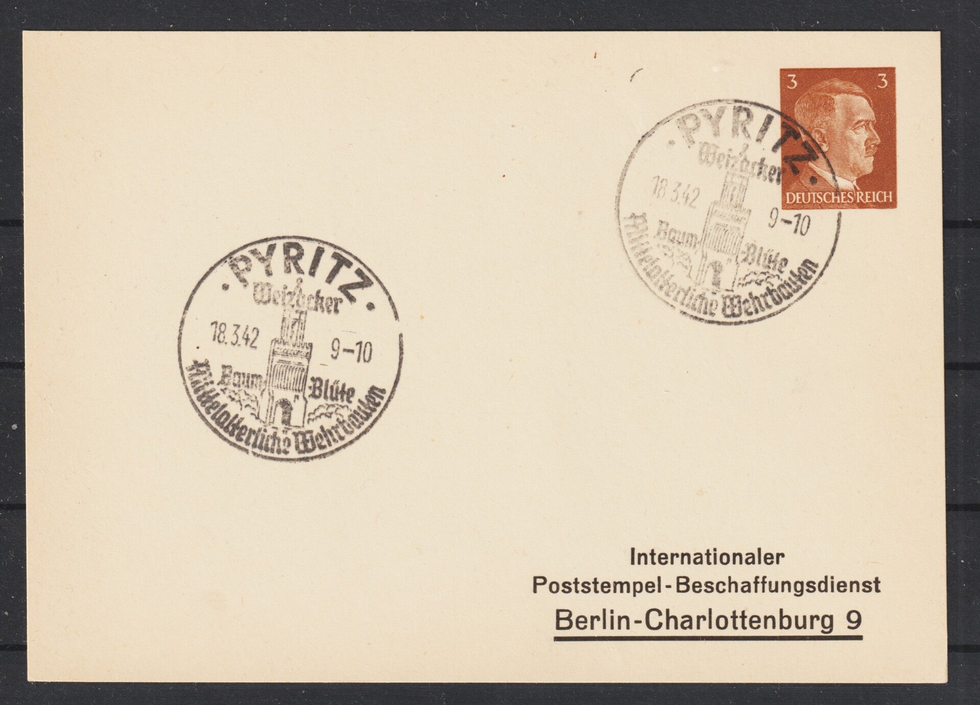 Sonderstempel: PYRITZ Weizucker Baum-Blüte Mittelalterliche Wehrbauten 18.3.42