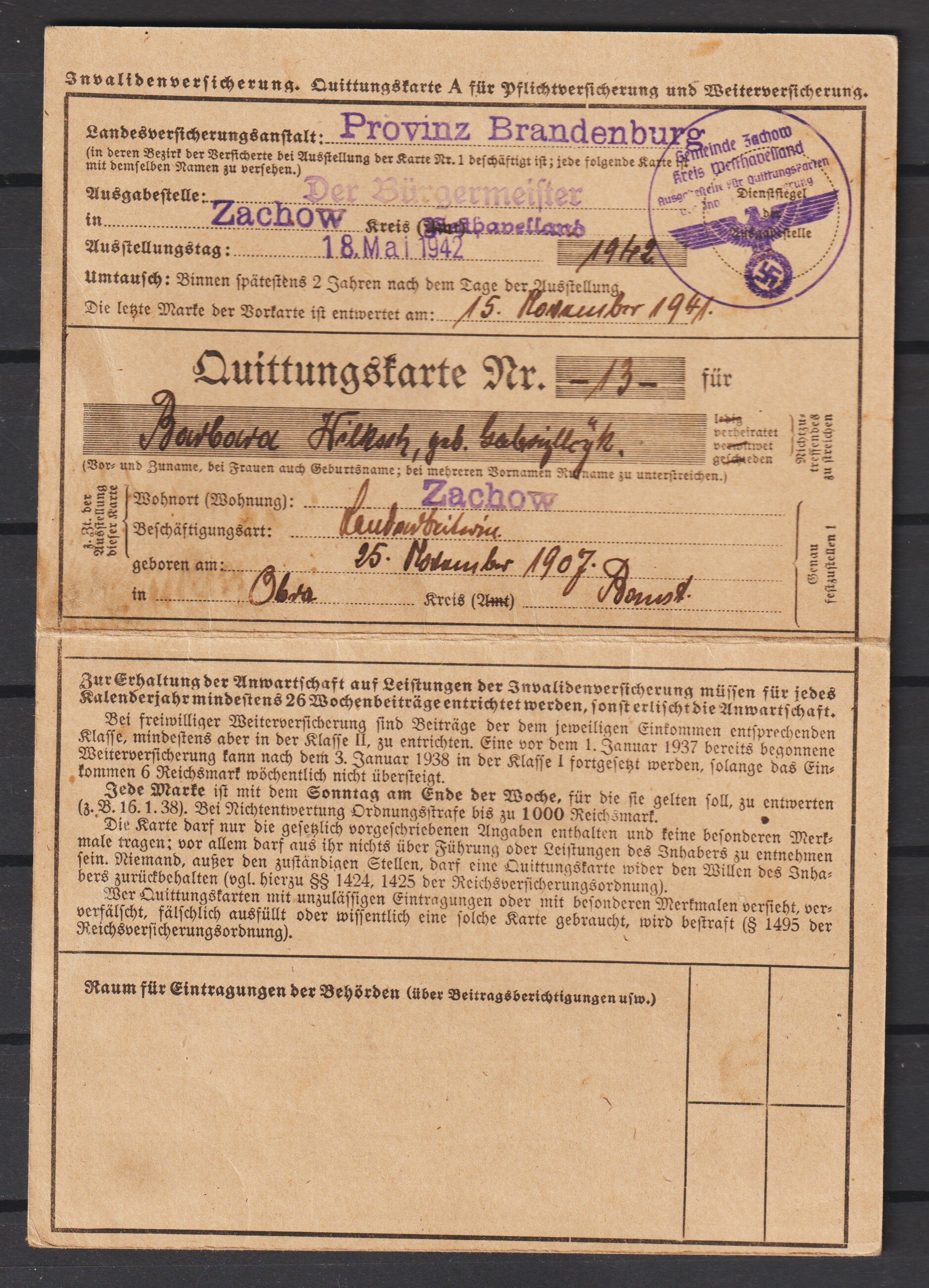 Quittungskarte Nr. 13, ZACHOW Kr. Westhavelland 18.Mai 42