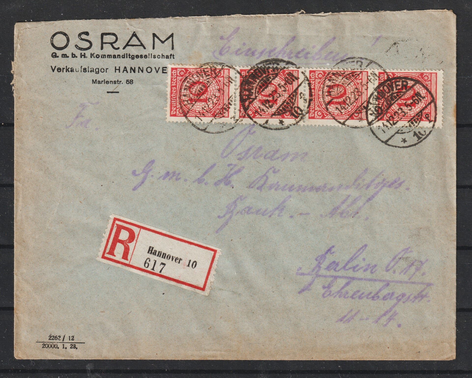 Portogerechter Dezember R-Brief von Hannover am 14.12.23 nach Berlin 15.12.23, auf der Rückseite Ankunftsstempel und 2 Vignetten der "OSRAM " Werke in der Portoperiode 27, Porto betrug 400 Milliarden oder 40 Pfennig (10 Milliarden = 1 Pfennig)