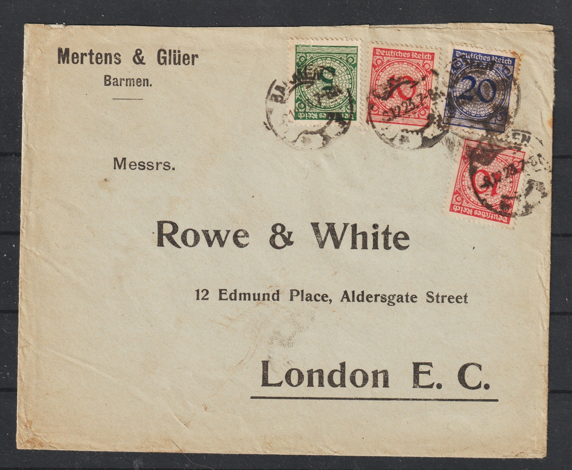 Portogerechter Dezember R-Brief über 20 g von Barmen am 8.12.23 nach London, auf der Rückseite 2 Vignetten der "MERTENS & GLÜER A.G. BARMEN" in der Portoperiode 27, Porto betrug 450 Milliarden oder 45 Pfennig (10 Milliarden = 1 Pfennig)