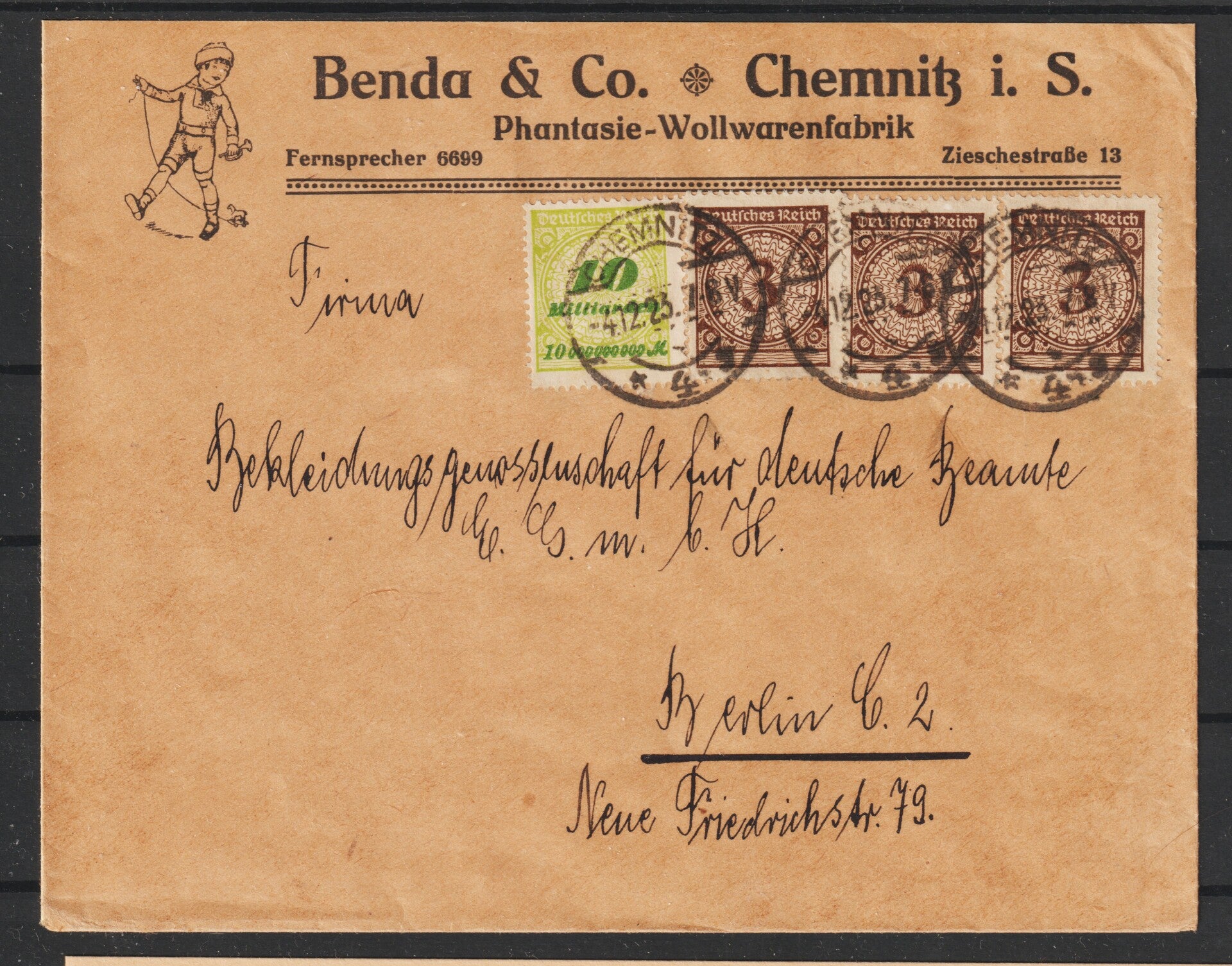 Portogerechter Dezember Brief (1x 328, 3x 338) von Chemnitz 4.12.23 nach Berlin in der Portoperiode 27, Porto betrug 100 Milliarden oder 10 Pfennig (10 Milliarden = 1 Pfennig)