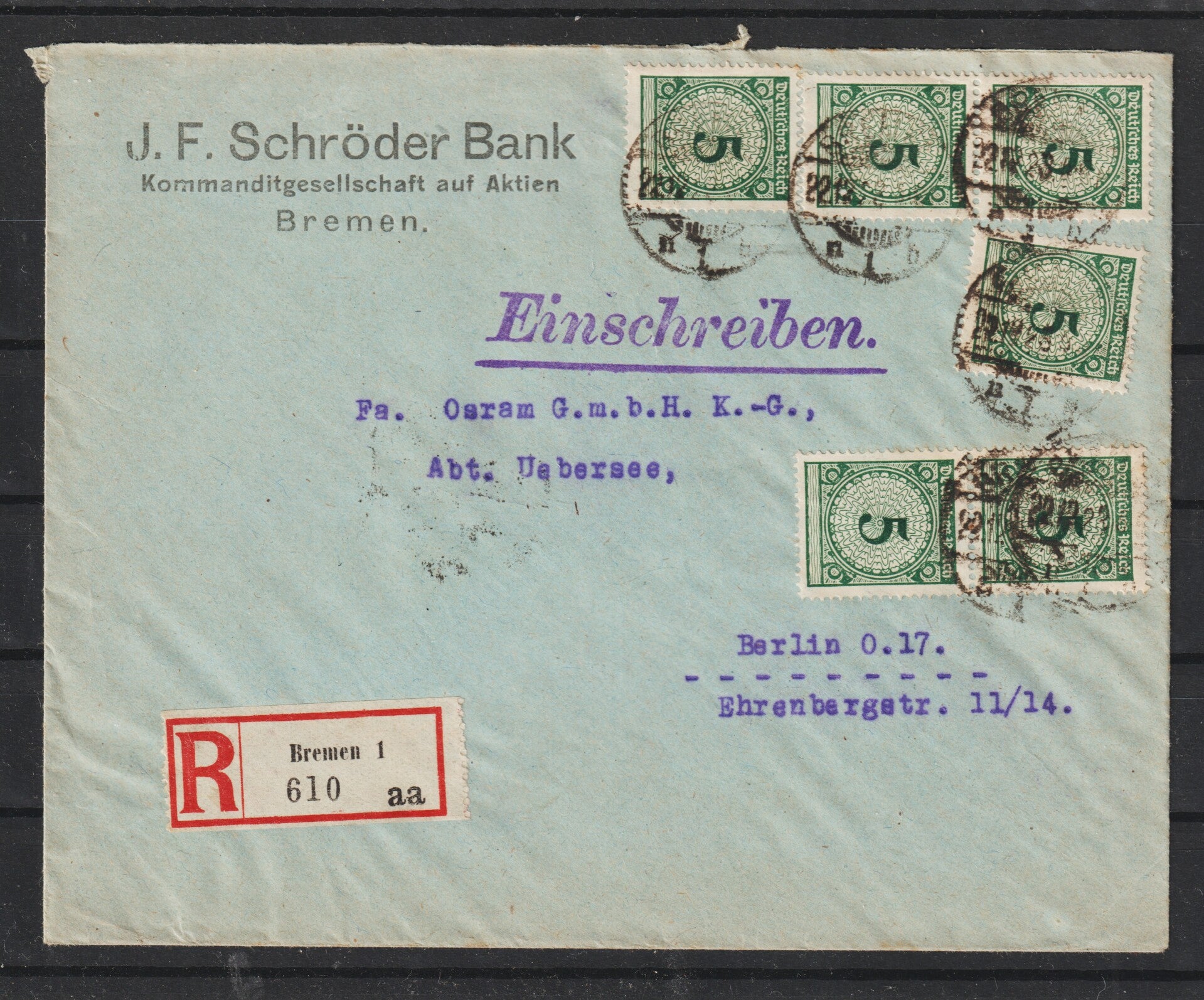 Portogerechter Dezember R-Brief (6x 338) von Bremen 22.12.23 nach Berlin in der Portoperiode 27, Porto betrug 300 Milliarden oder 30 Pfennig (10 Milliarden = 1 Pfennig)