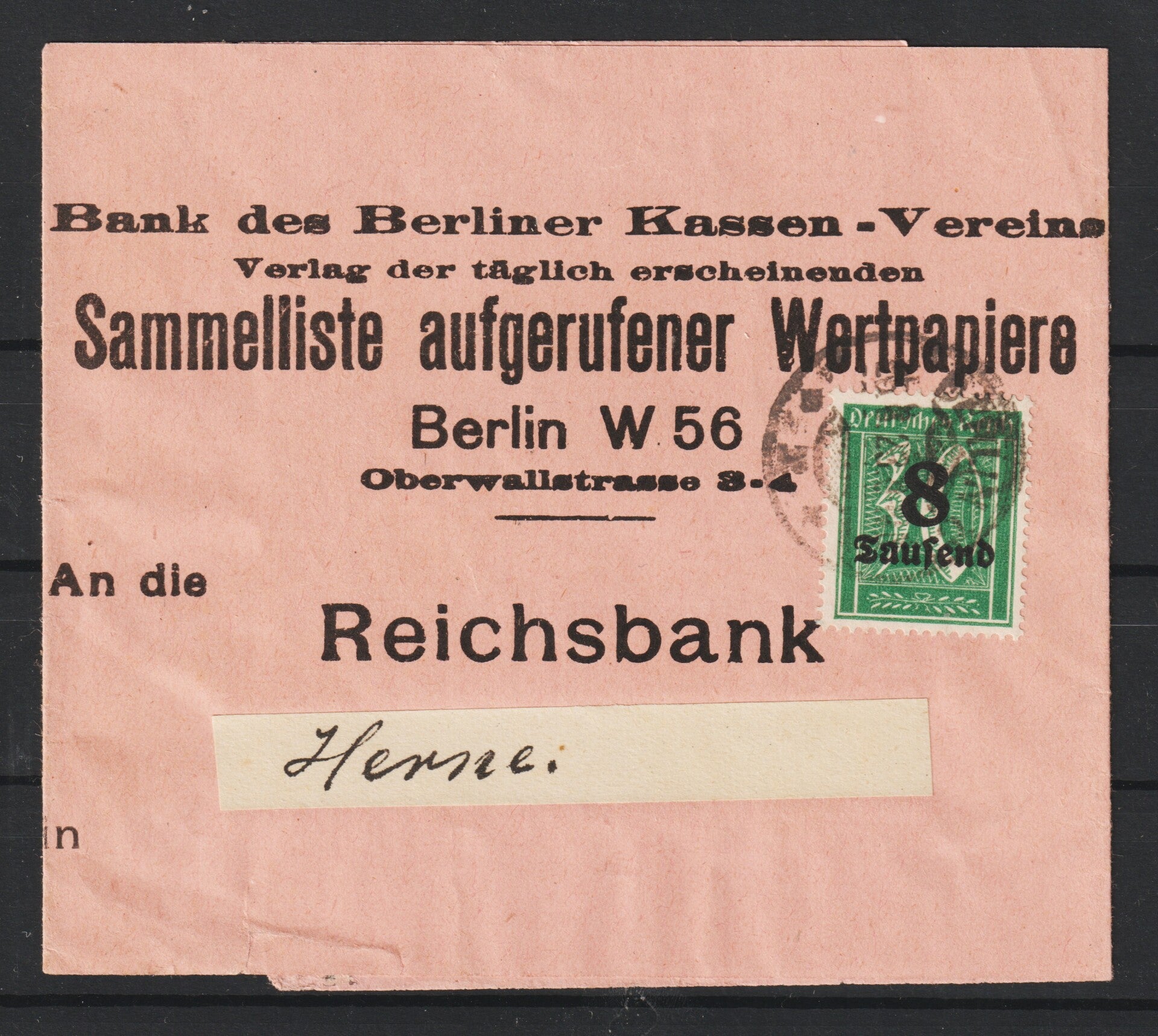 MiNr. 278 auf portogerechten Streifband von Berlin 25.8.23 nach Herne in der Portoperiode 16, Porto betrug 8 Tausend Mark für eine Drucksache bis 50 g