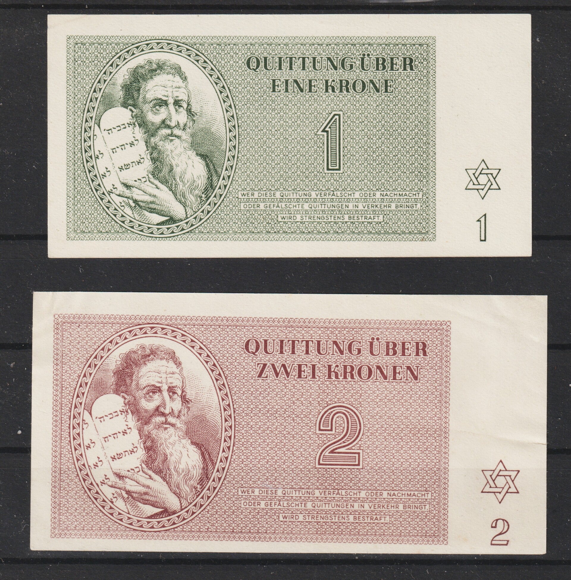 Ghetto Theresienstadt 1943, Quittung über 1 und 2 Kronen