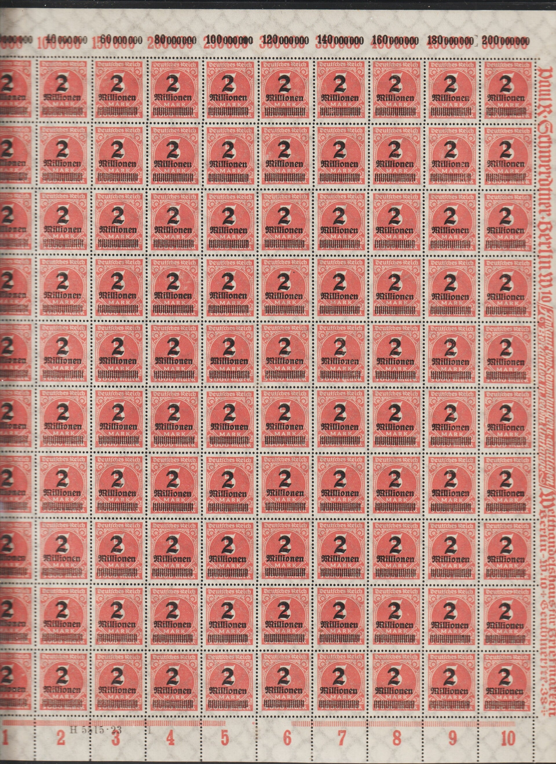 MiNr. 312 postfrischer Bogen, Platte 1-1, Plattenfehler IV