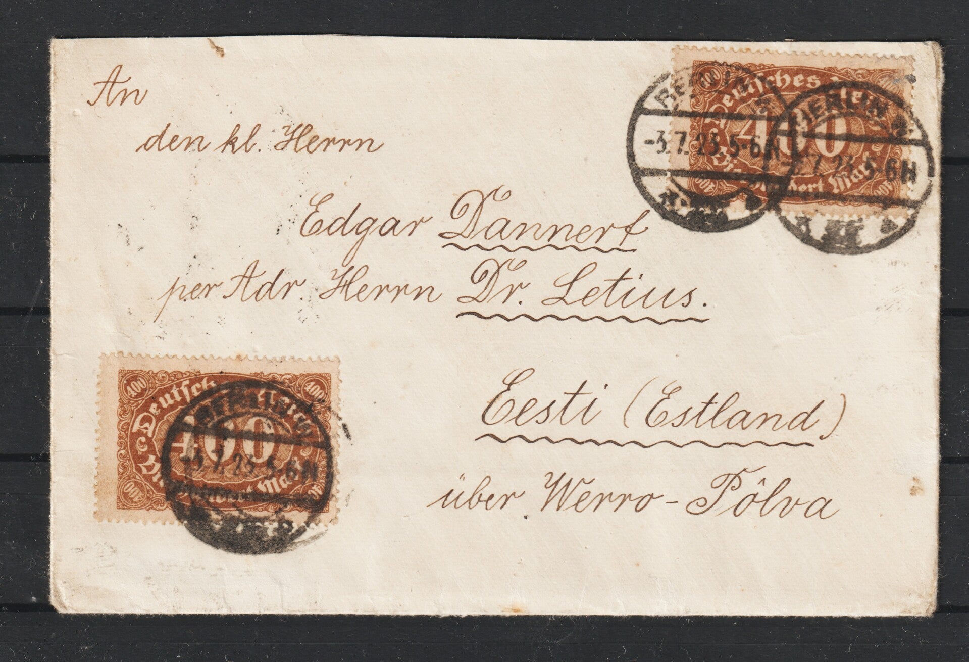 MiNr. 250 portogerechte Mehrfachfrankatur auf Brief nach Esti Estland vom 3.7.23