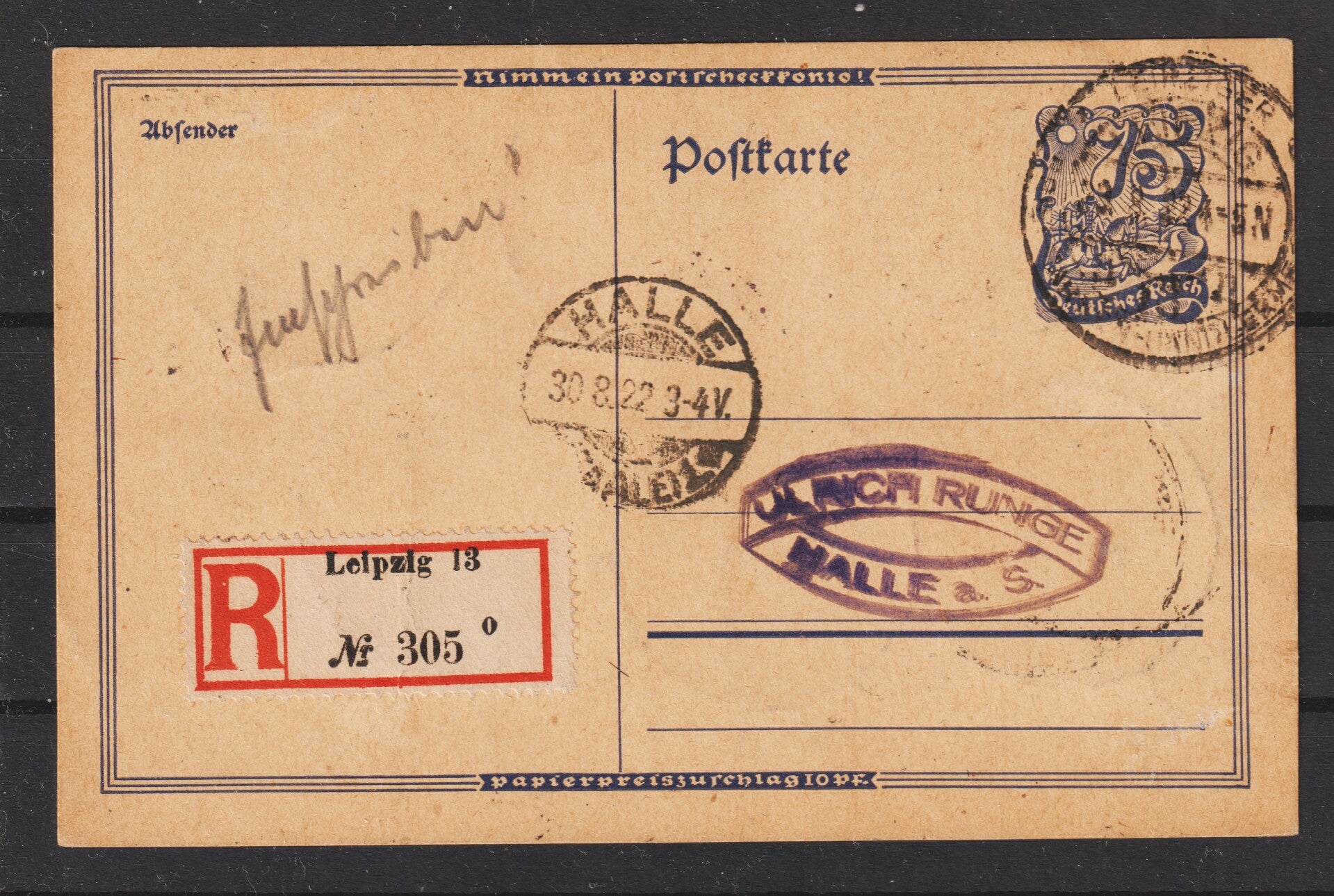 MiNr. 210-218 gestempelt auf GA P 146 als R-Postkarte von Leipzig nach Halle am 29.8.23 gelaufen, geprüft, Katalogpreis: 160,00 € +++ vorletzte mögliche Verwendungstag