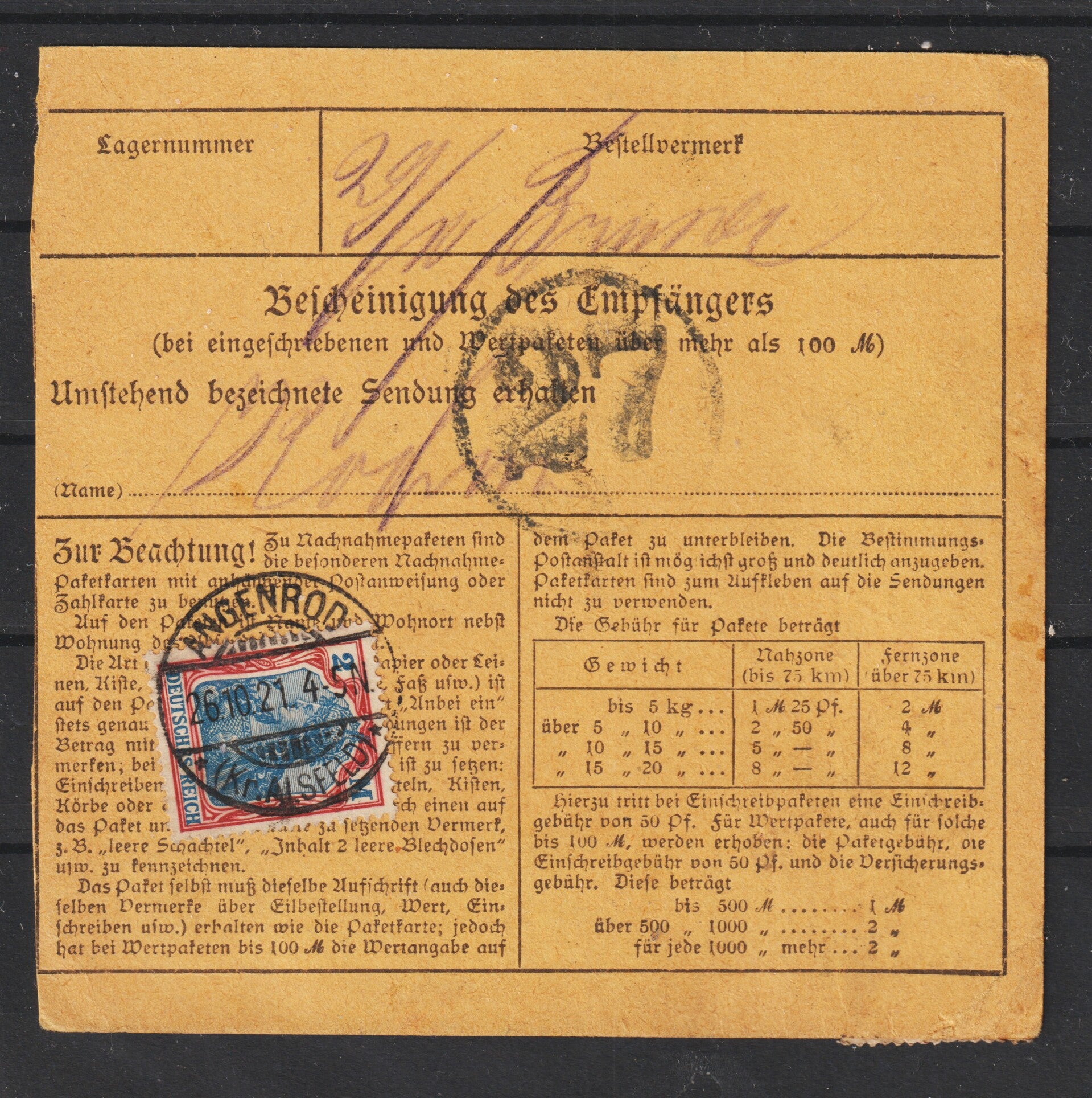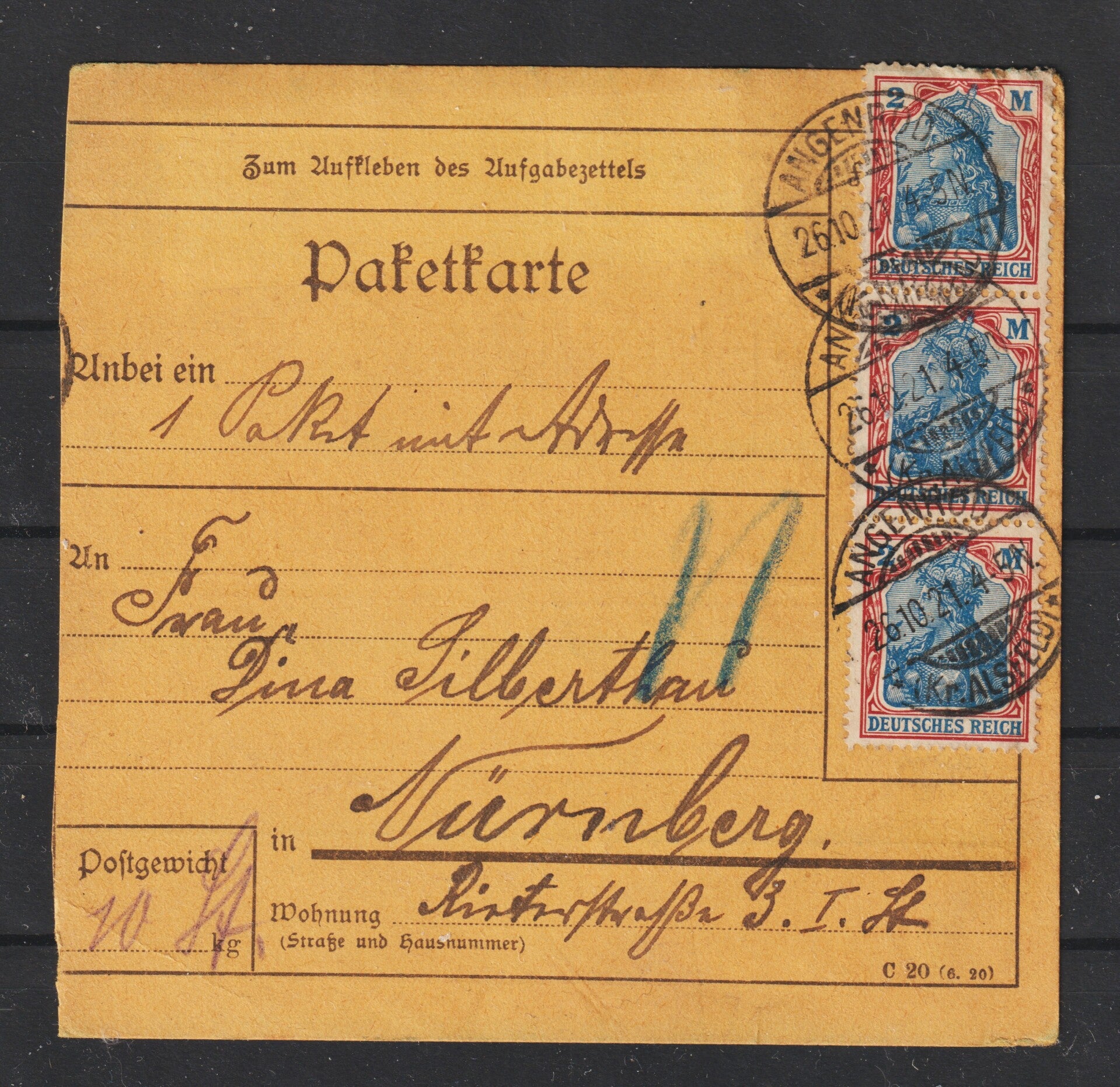 MiNr. 152 Mehrfachfrankatur auf Paketkarte Von ANGENROD (ein kleiner Ort mit 500 Einwohnern) nach Nürnberg am 26.10.21