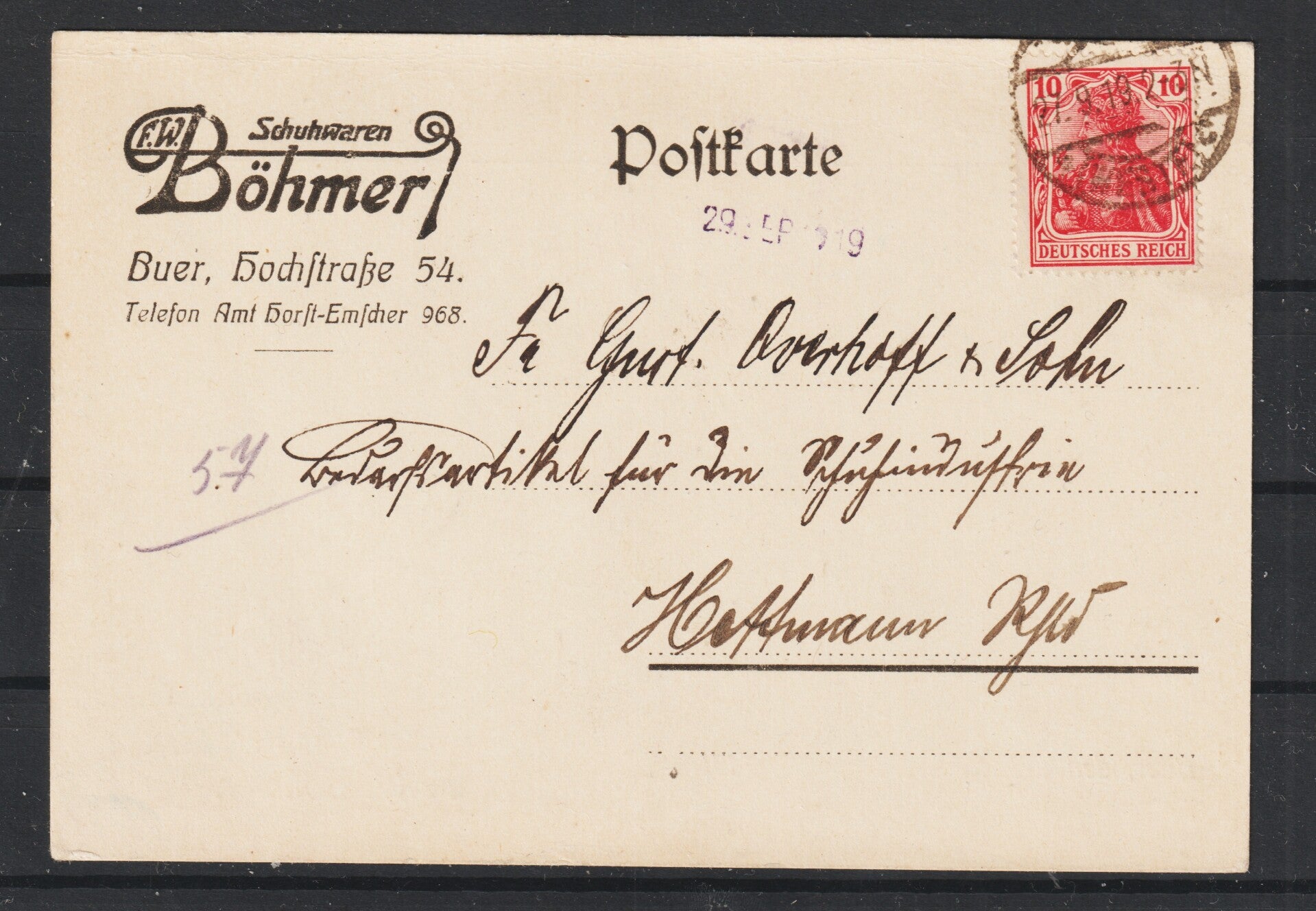 Privat-Postkarte "Schuhwaren Böhmer" BUER 27.9.10