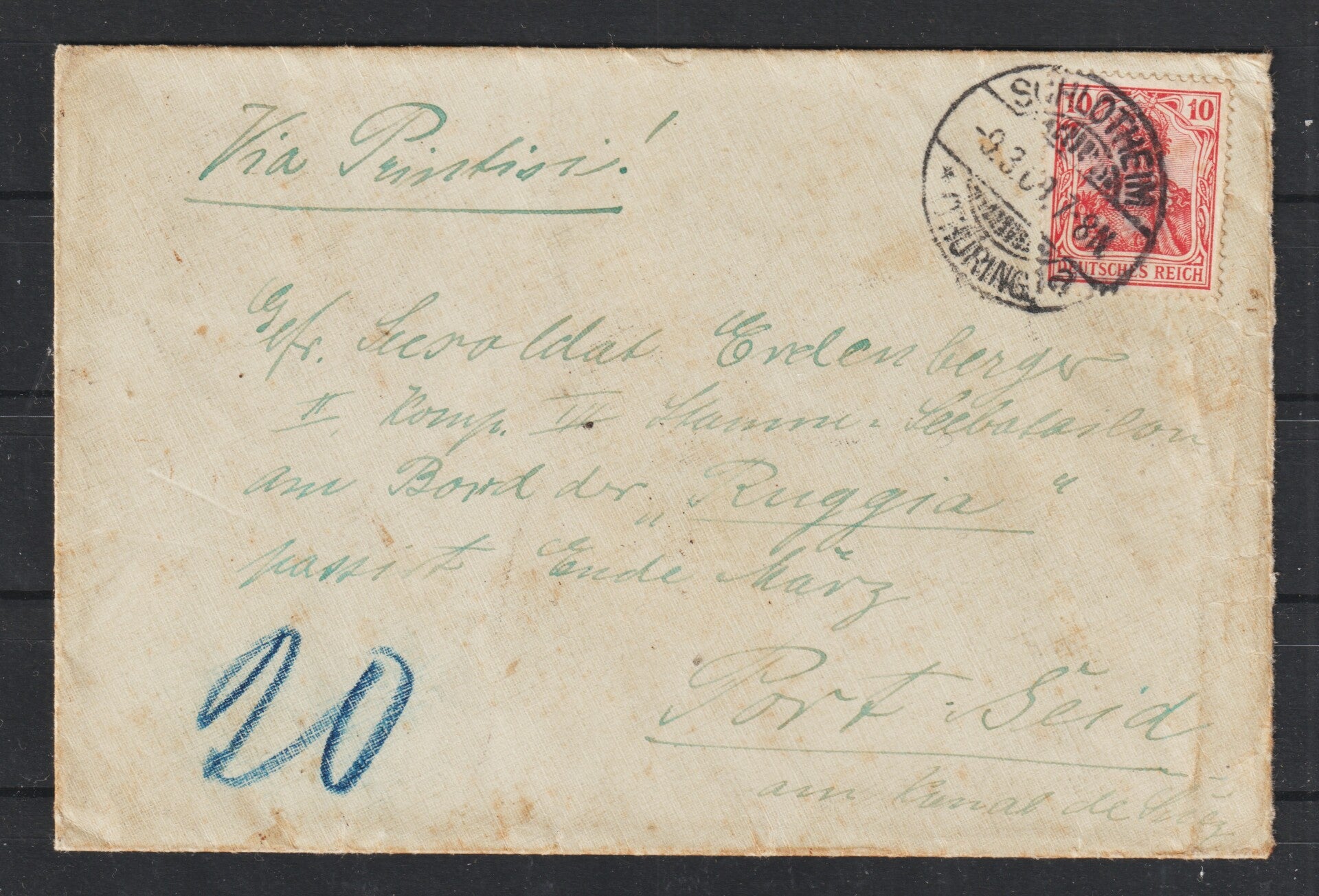 MiNr. 86 Brief SCHLOTHEIM (THÜRINGEN) 9.3.08 nach Port Said, mit 20 Pfennig Nachporto belegt