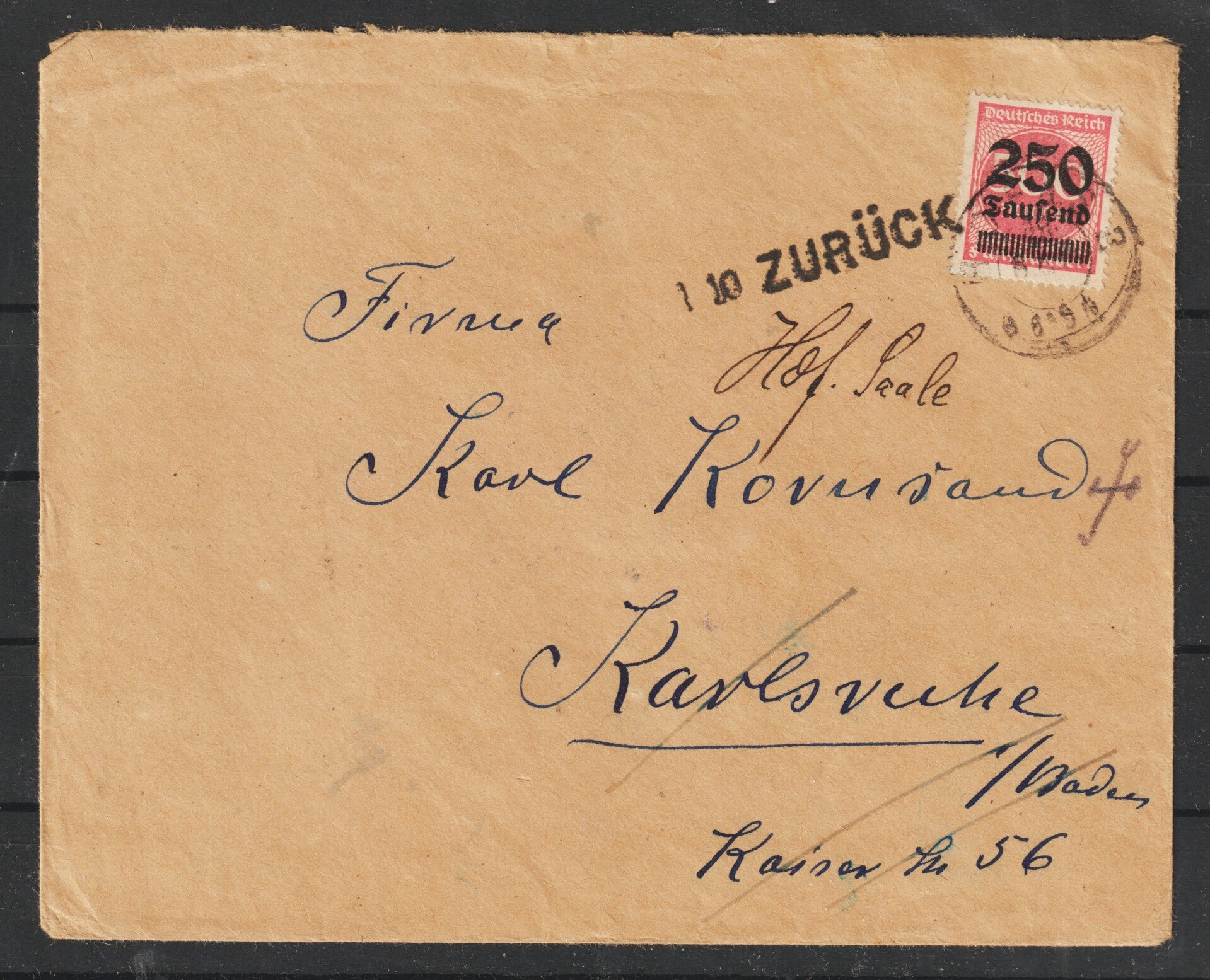 MiNr. 295 Einzelfrankatur auf portogerechten Brief von Hof a.S. (an der Saale) am 28.Sep.23 nach Karlsruhe, Empfänger gestorben, zurück