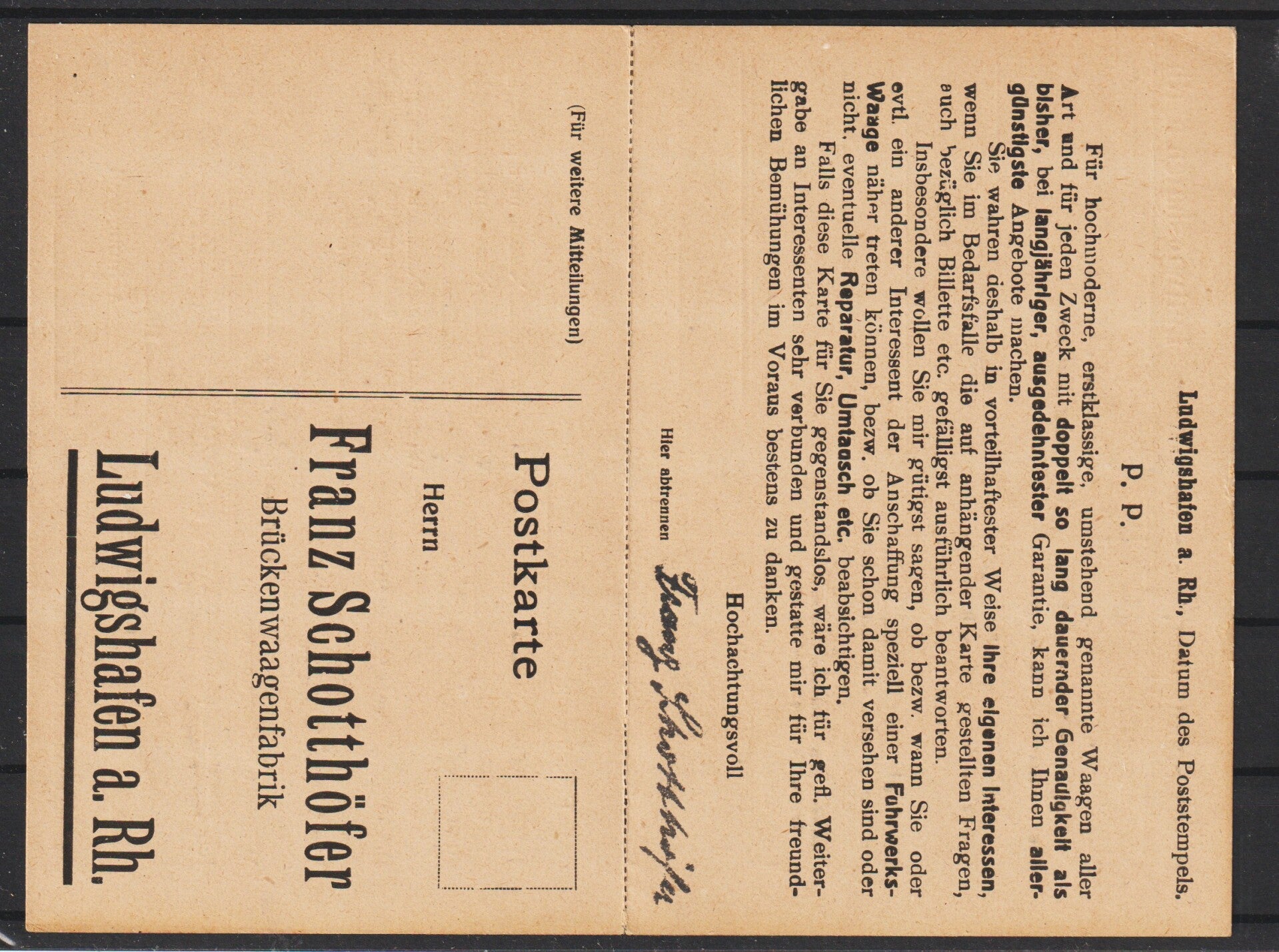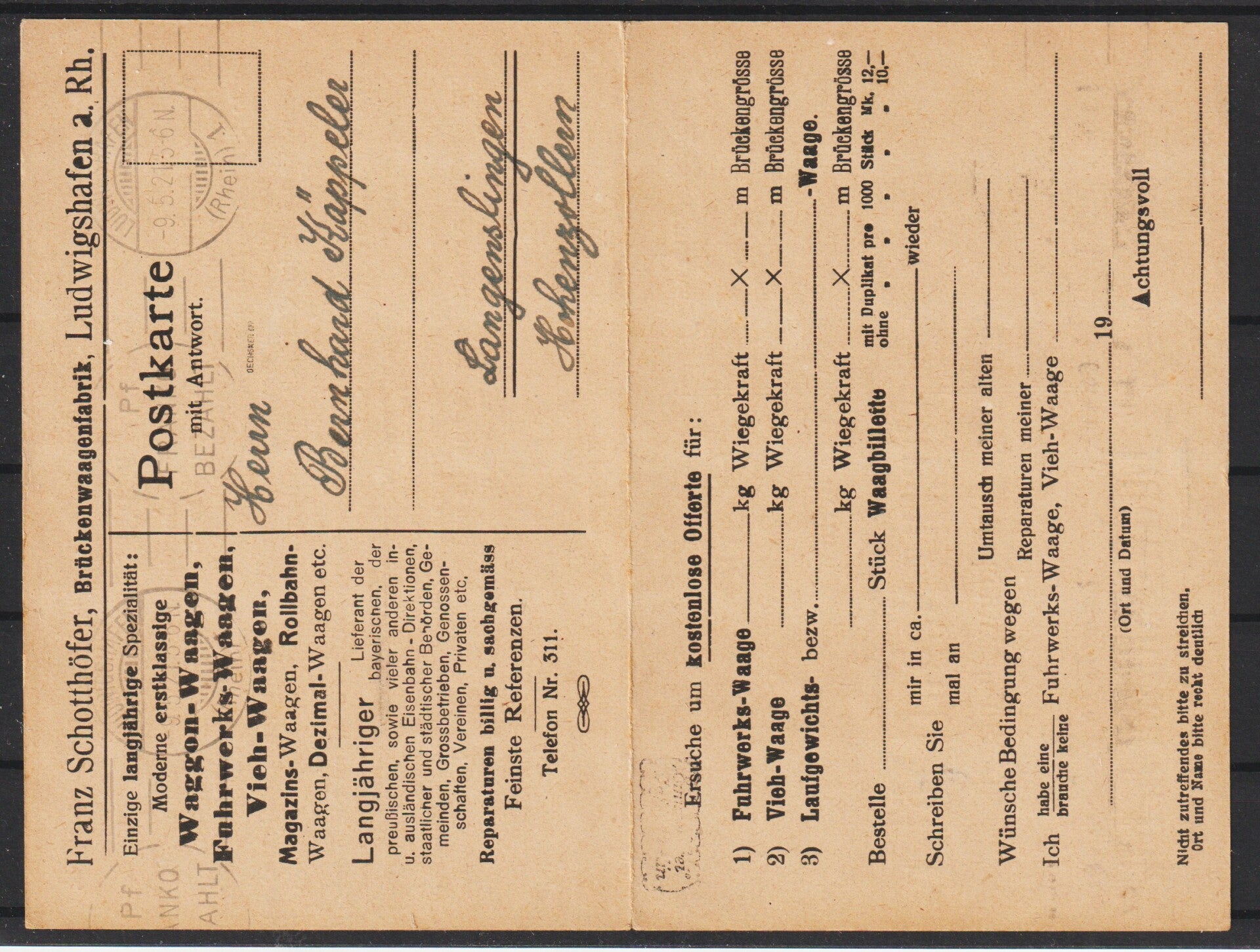 Privat Postkarte mit Antwortkarte, Maschinen-Stempel " Pf FRANKO BEZAHLT", LUDWIGSHAFEN 9.5.21, geprüft