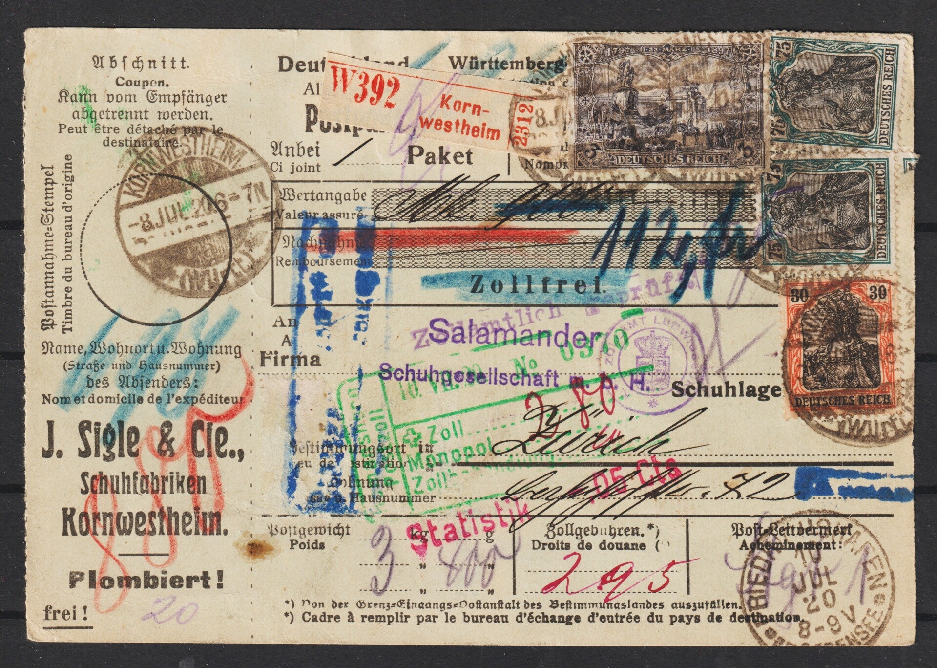 MiNr. 96 (2x) in Mischfrankatur auf Paketkarte von KORNWESTHEIM nach Zürich am 8.JUL.20