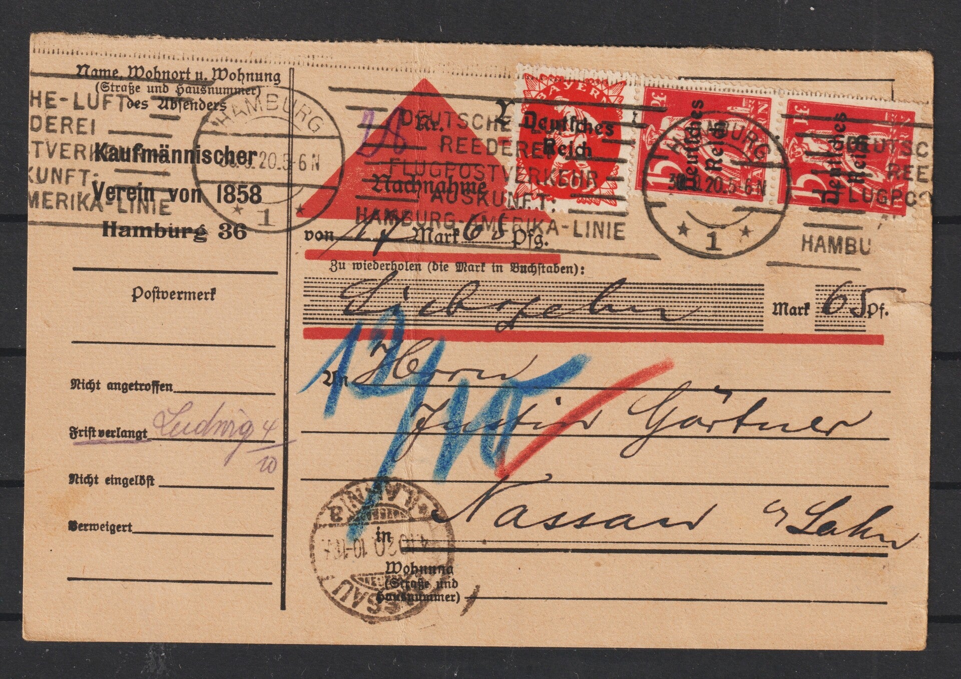 MiNr. 121 (2x), 125 auf Nachnahme Karte von HAMBURG nach Nassau am 30.9.20