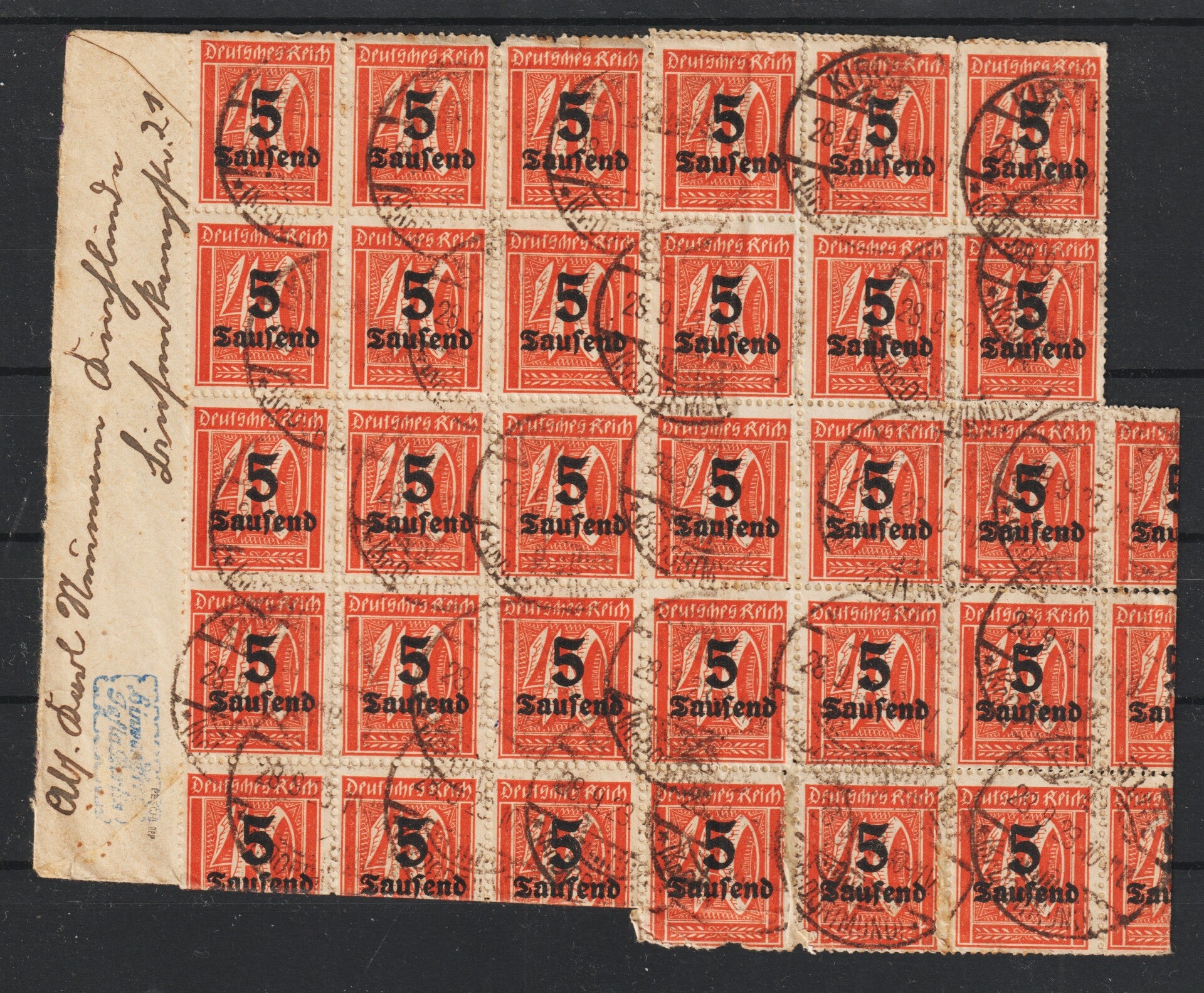 MiNr. 277 (48x) auf Brief KIRCHLINDE 28.9.23, geprüft