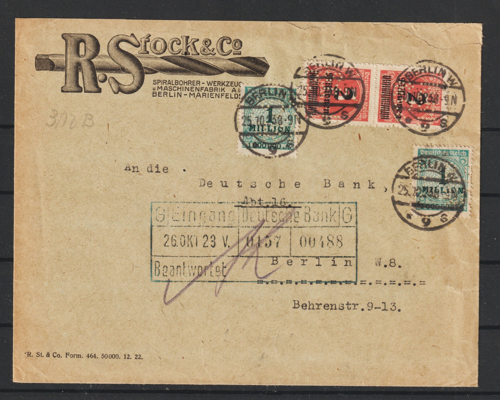 MiNr. 312 B (2x) 314 (2x) auf Brief BERLIN 25.10.23, Firmenlochung (s24048)