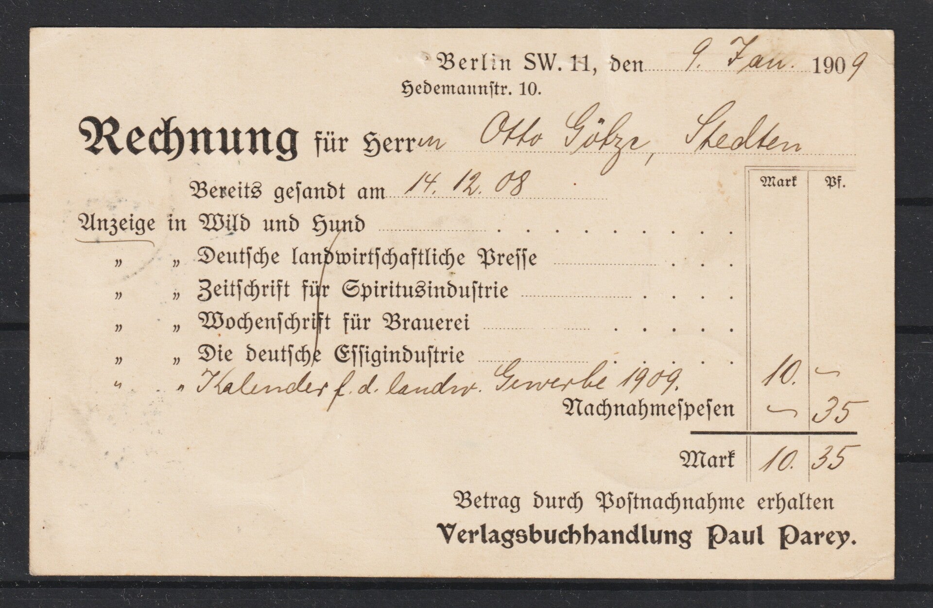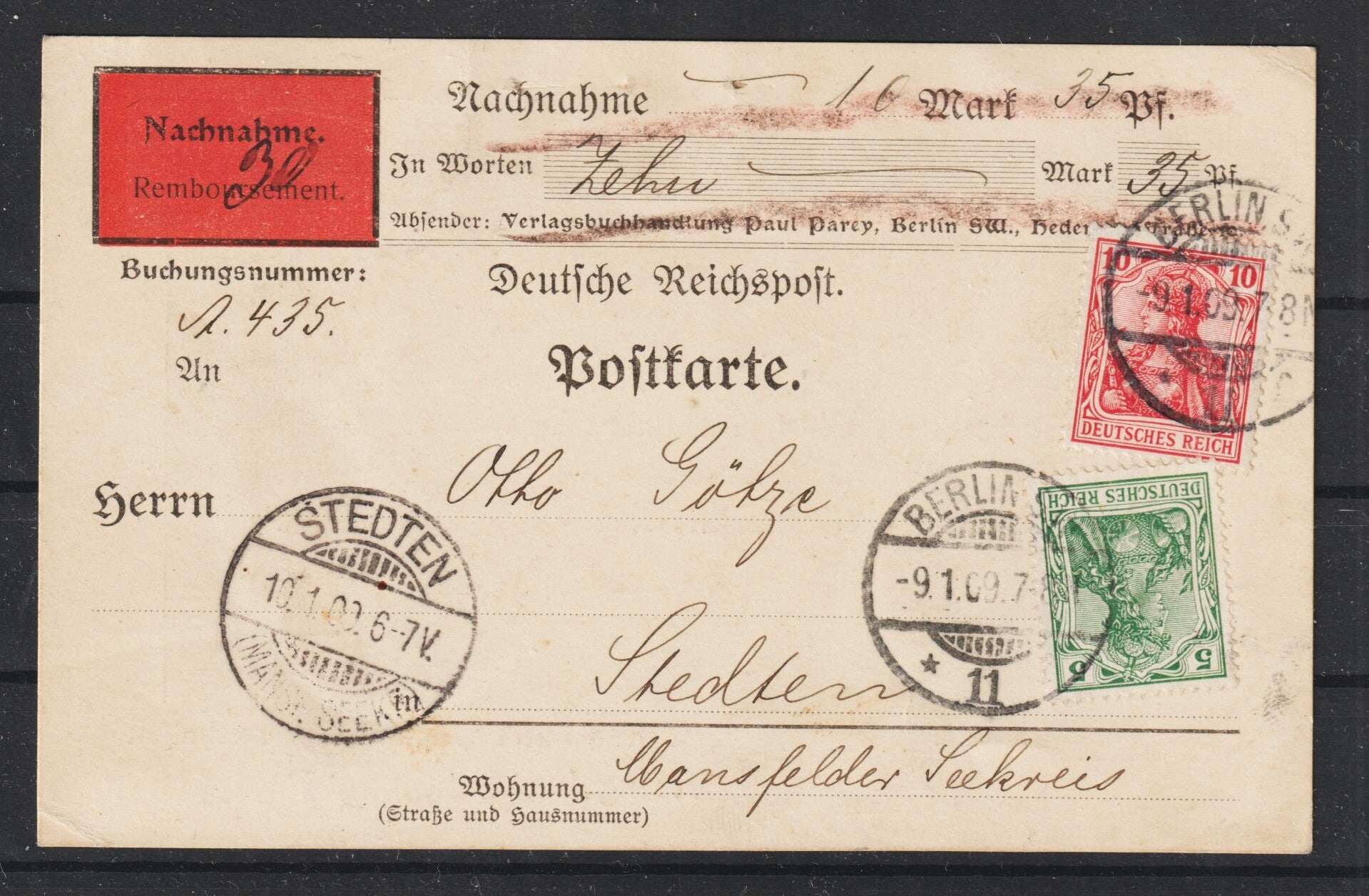 MiNr. 85 I, 86 I, auf Nachnahme Karte, BERLIN 9.1.09 Ankunftsstempel STEDTEN 10.1.09 (kleiner Ort mit damals 750 Einwohnern)