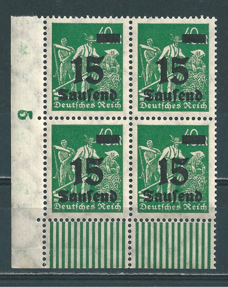 MiNr. 279 postfrische Bogenecke, Randzähler 5, Plattenfehler I: 1 der Wertangabe 15 ohne Anstrich - Feld 92, geprüft Fleiner BPP, Michelwert: 70,00 €
