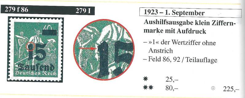 MiNr. 279 postfrisch, Plattenfehler I: 1 der Wertangabe 15 ohne Anstrich, 5 mit Delle am Aussenbogen - Feld 86, geprüft Fleiner BPP, Katalogpreis: 70,00 €