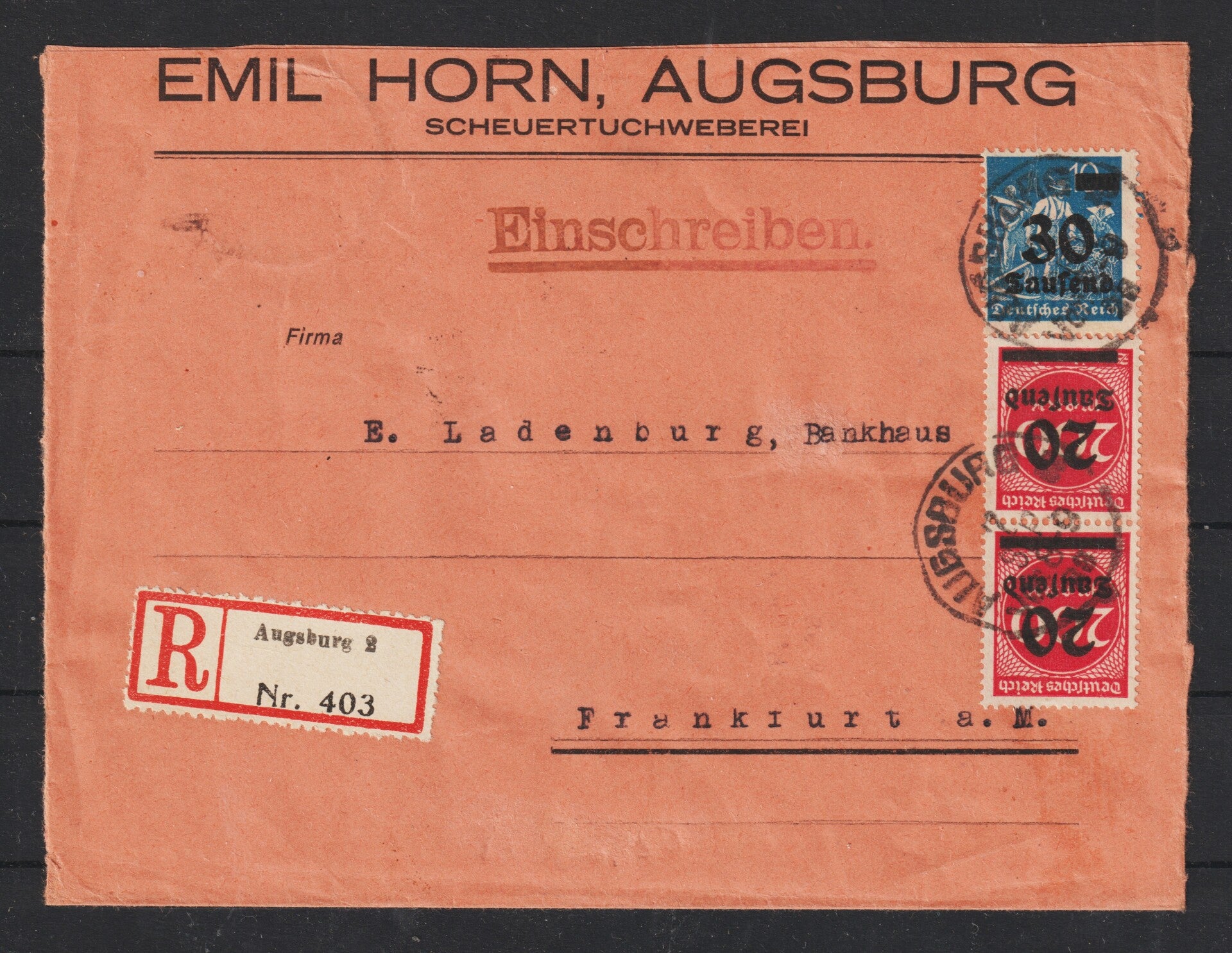 MiNr. 282 II (6x), 284 auf portogerechten R-Brief AUGSBURG 7.SEP.23