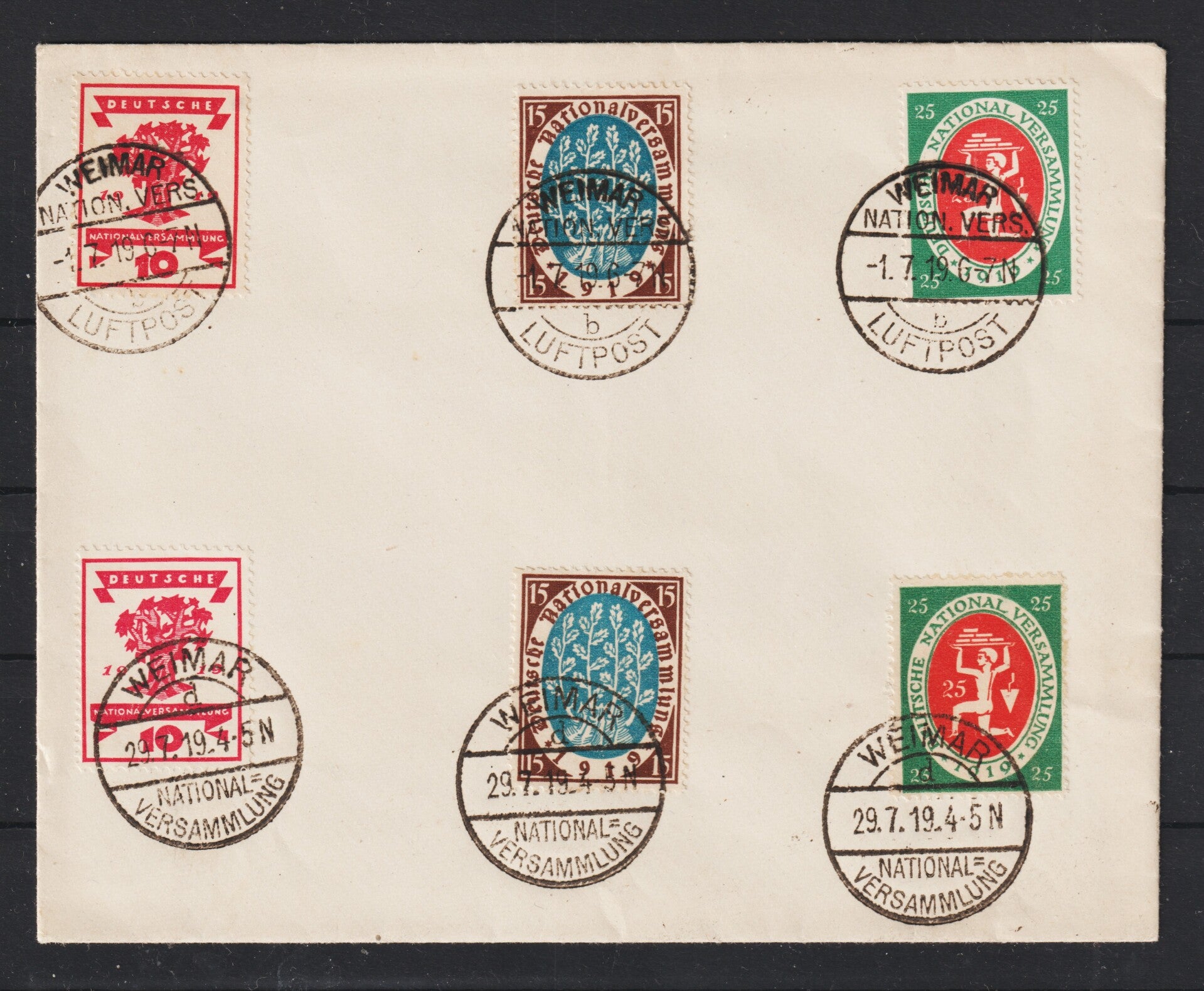 MiNr. 107-109 auf FDC, mit dem selteneren Luftpost-Ersttags-Stempel Weimar/Nationalversammlung 1.7.19 und dem Sonderstempel: Weimar Nationalversammlung 29.7.19