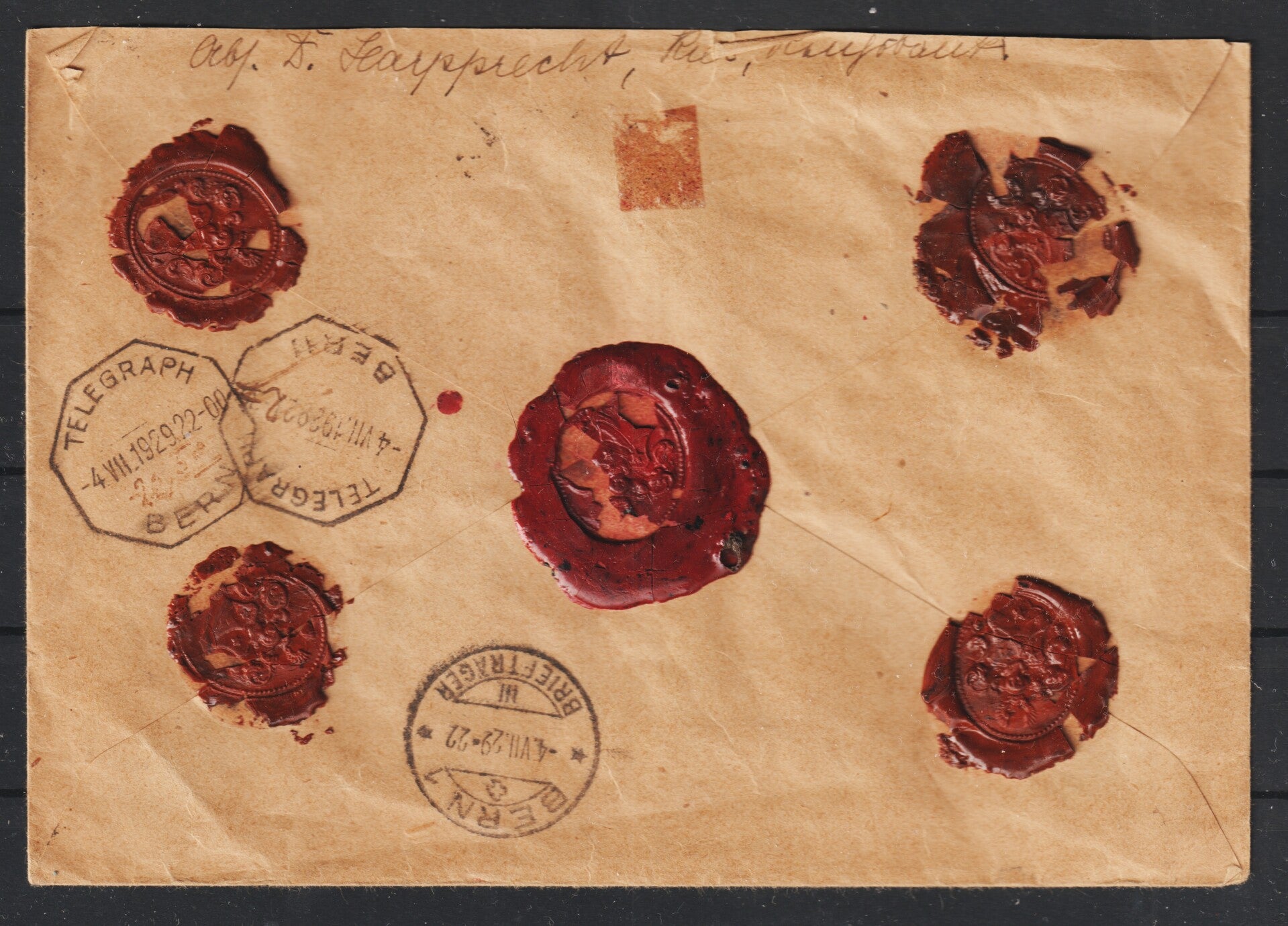 MiNr. 415, 417, 419, 420, 390 auf Luftpost Express Wert-Brief mit V Zettel KIEL 3.7.29 nach Bern / Schweiz