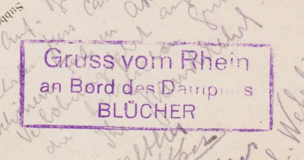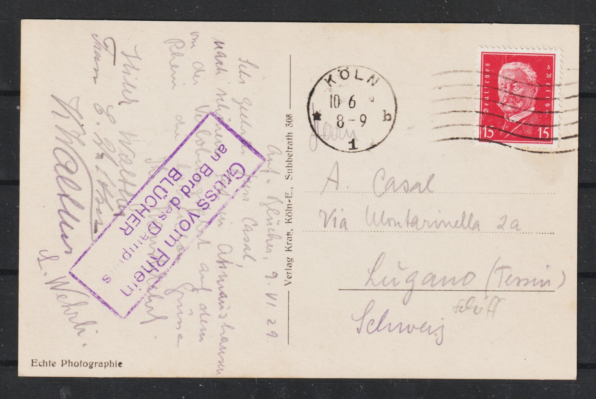 MiNr. 414 Postkarte, Bordstempel: "Gruss vom Rhein An Bord des Dampfers Blücher" KÖLN 10.6.29