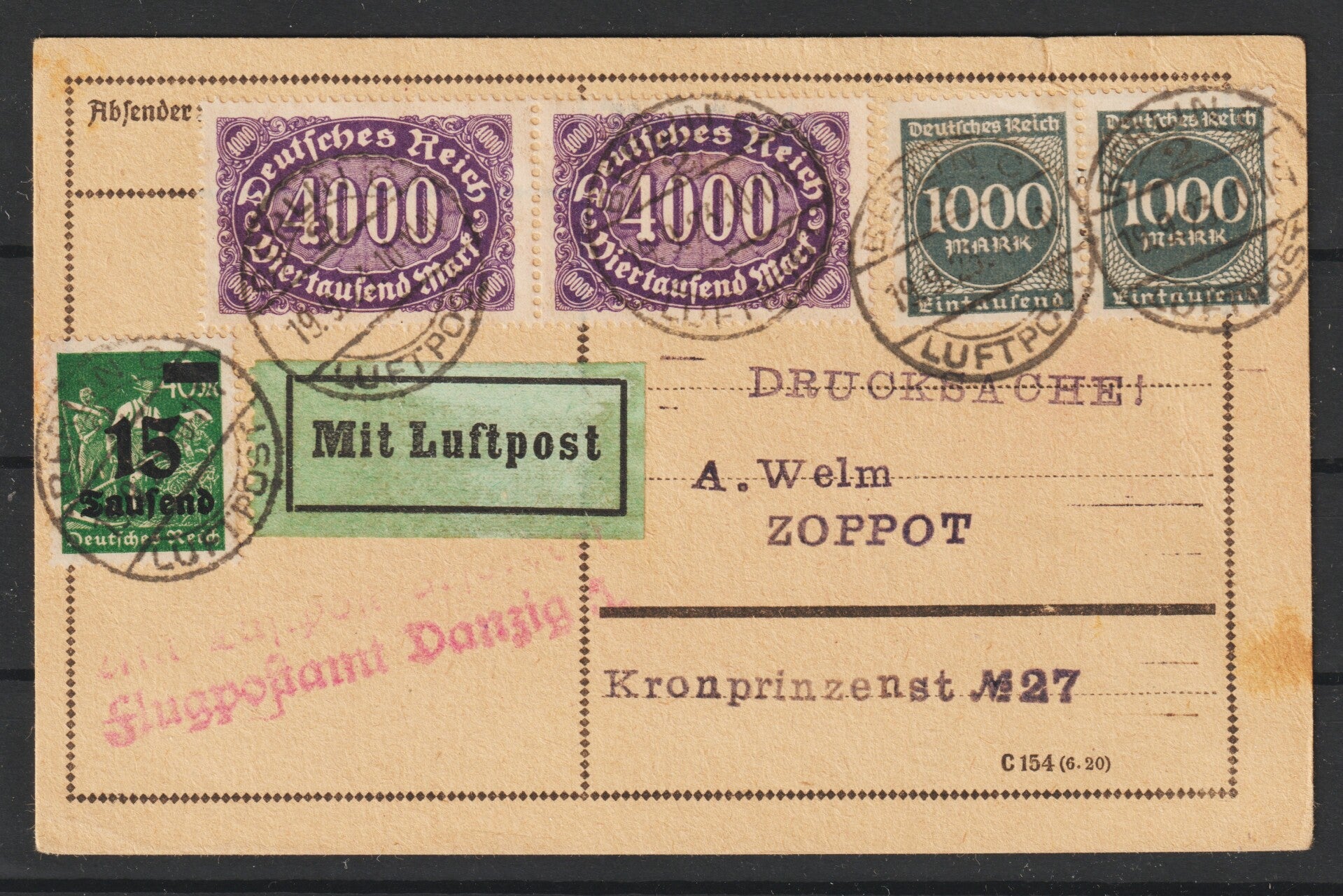 Luftpost Karte von BERLIN nach DANZIG am 19.9.23