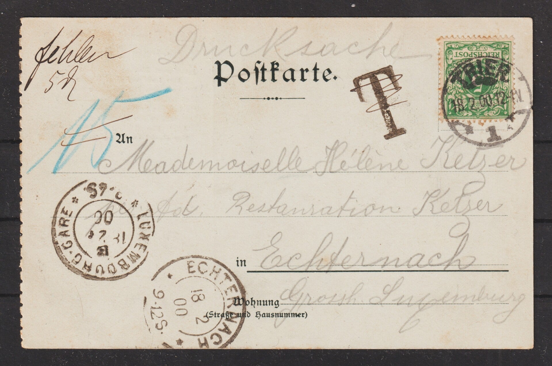 MiNr. 46 auf Postkarte von TRIER 18.2.00 nach Echternach in Luxemburg, Portokontrolle, 5 Reichspfennig fehlen, dreifacher Preis für die Nachgebühr handschriftlich vermerkt