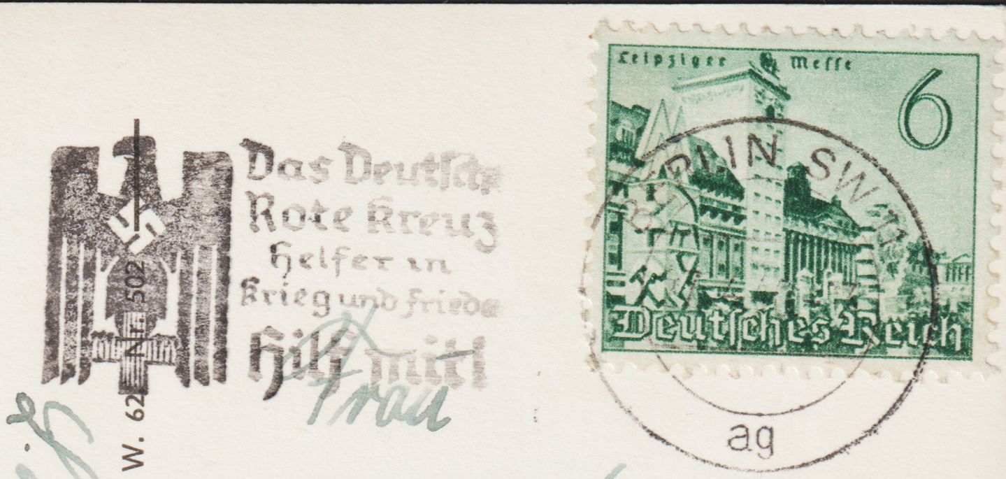 MiNr. 740 EF auf Ansichtskarte von Potsdam Sanssouci, BERLIN 27.4.40 und Werbestempel “Das Deutsche Rote Kreuz, Helfer in Krieg und Friede, Helf mit”